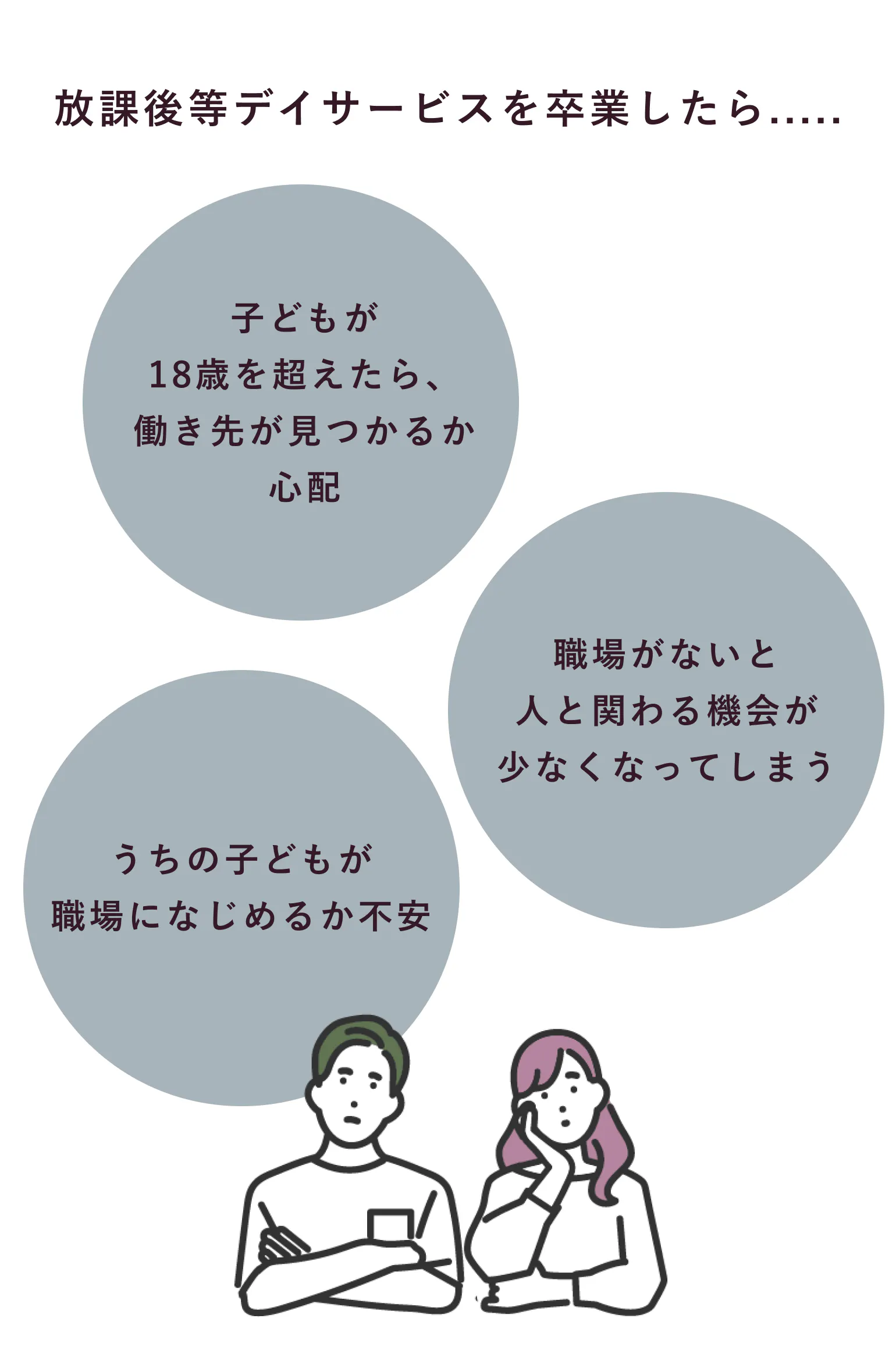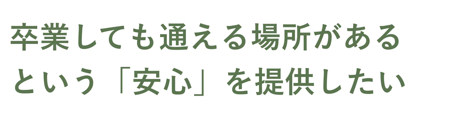 私たちは放課後等デイサービス「コプラス」を卒業しても、就労継続支援B型事業所「コプラスステップ」に通えるという「安心」を保護者のみなさまに届けたいと思っています。