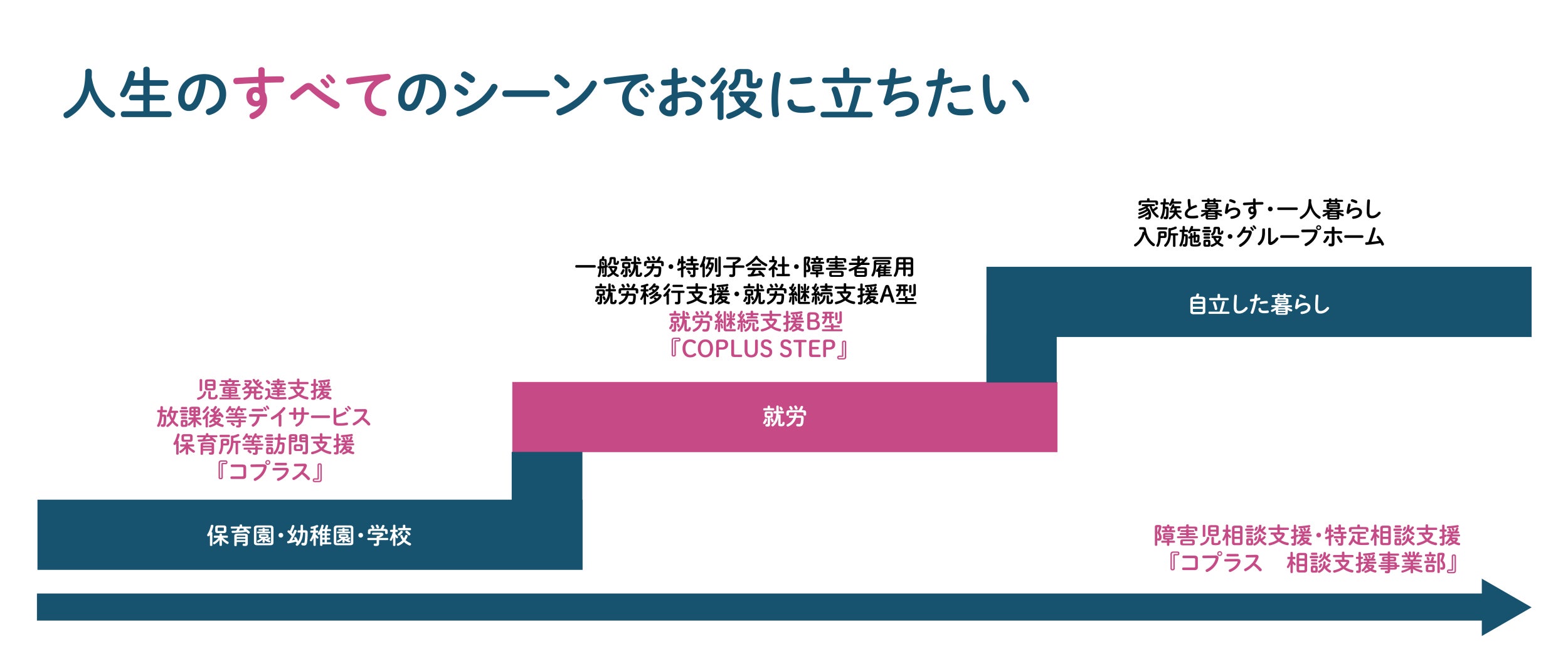 私たちは放課後等デイサービス「コプラス」を卒業しても、就労継続支援B型事業所「コプラスステップ」に通えるという「安心」を保護者のみなさまに届けたいと思っています。
