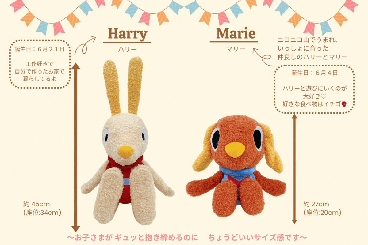 Harry&Marieのファンのみなさまからの「ぬいぐるみがほしい」というあたたかいお声から、主人公のうさぎ「ハリー」とヒロインのわんちゃん「マリー」のぬいぐるみができあがり 2024年5月の第5回目となるHarry&Marie展覧会でお披露目致しました。