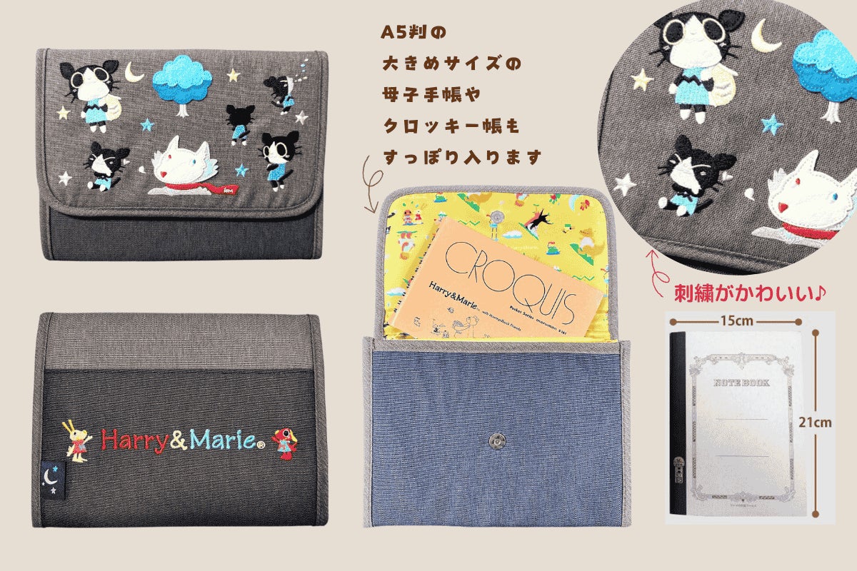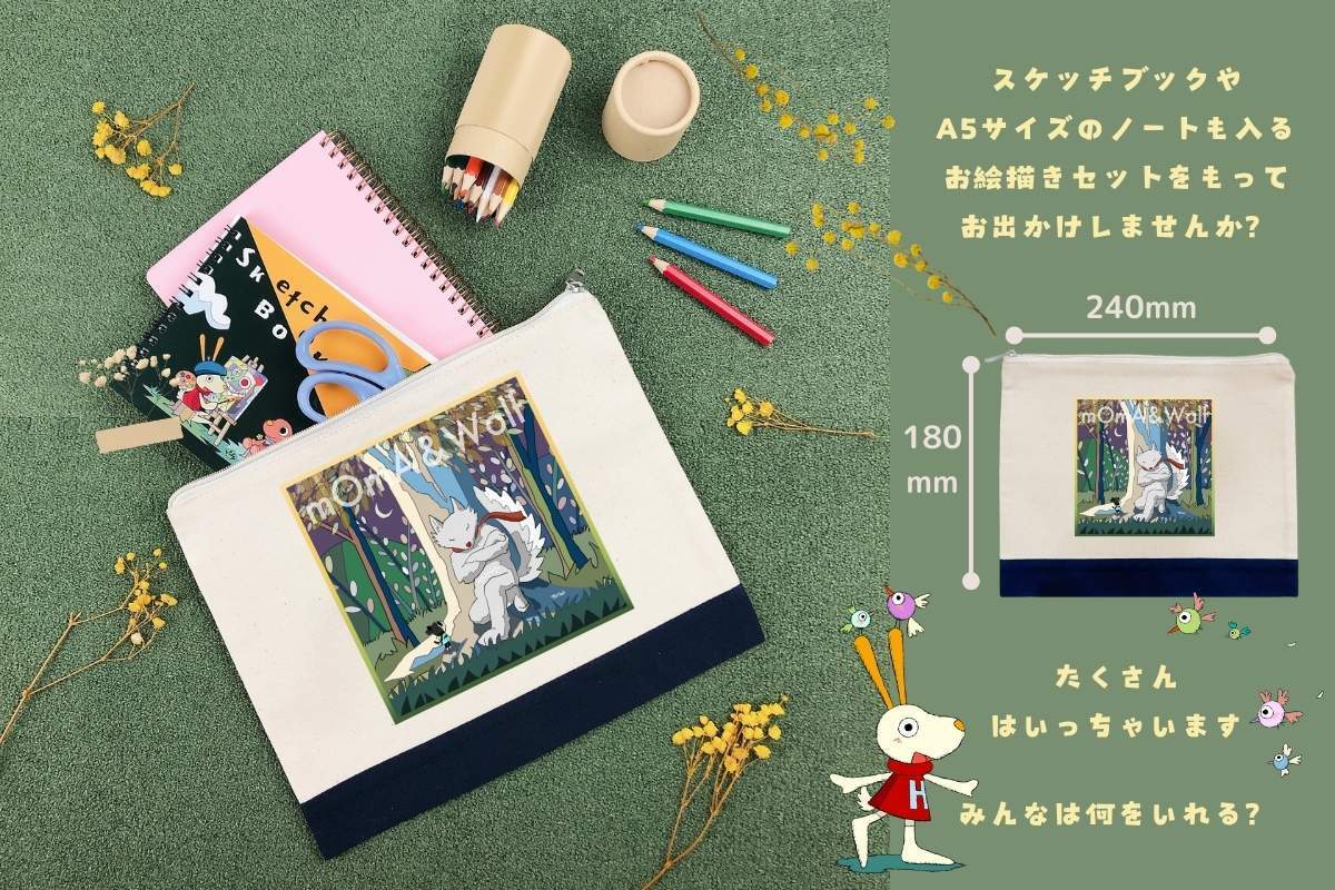 モマちゃんがウォルフさんのモノマネをしているイラストが刺繍でかわいくはいったマルチケースです。