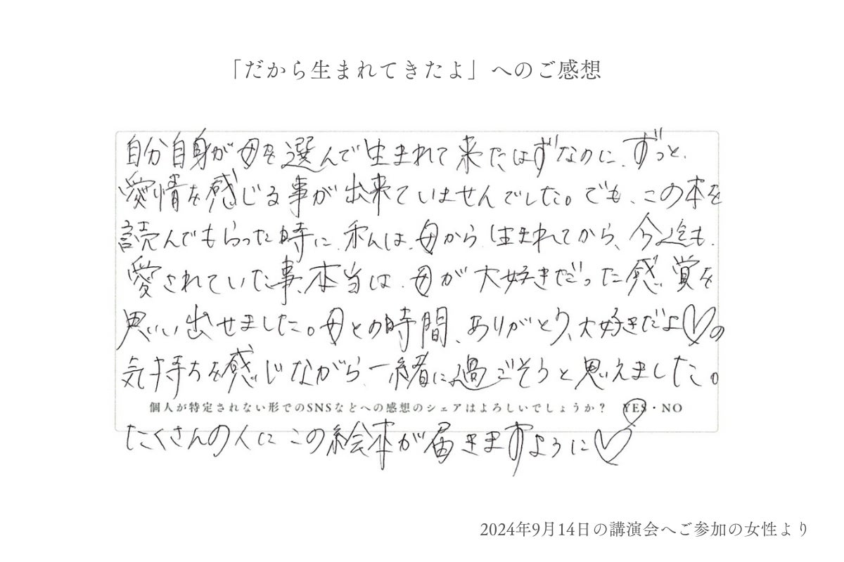 「ずっと愛情を感じることが出来ていませんでした。でも、この本を読んでもらった時に、私は母から今までも愛されていたこと、本当は母が大好きだった感覚を思い出せました。~中略~ たくさんの人にこの絵本が届きますように」 40代女性