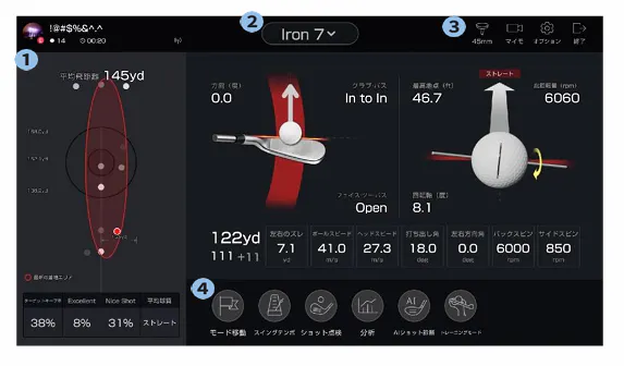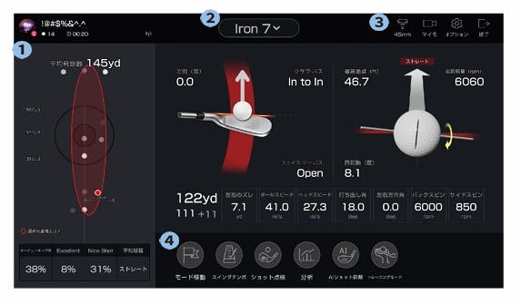 ボールスピード/発射角/左右方向角/バックスピン/サイドスピン/回転軸データが見えるかされます。