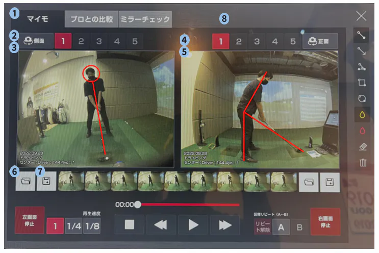 映像で自分のスイング姿勢を様々なツールを使ってスイングモーションを詳しく分析できます。スロー再生(1/8)や線を引くことでスイング軸や前傾姿勢をチェックできます。