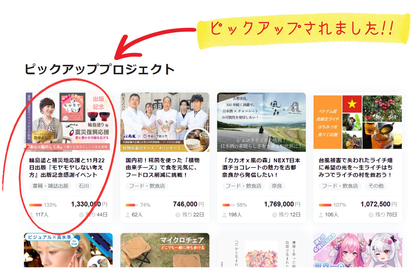 皆様の応援のおかげで「ピックアッププロジェクト」に選んでいただく事が出来ました。