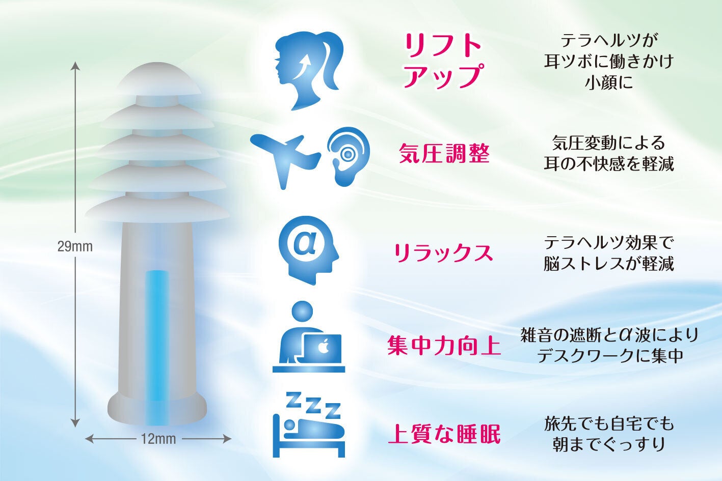 頭蓋骨調整小顔術は脳脊髄液の分泌を促すことの出来る稀な技術です。小顔術から耳つぼや耳周りの骨が 小顔やリフトアップに大きく影響することに気づき、耳栓に遠赤外線の一番コアとなる テラヘルツ波を転写した新用品テクノロジーイヤープラグを開発いたしました。