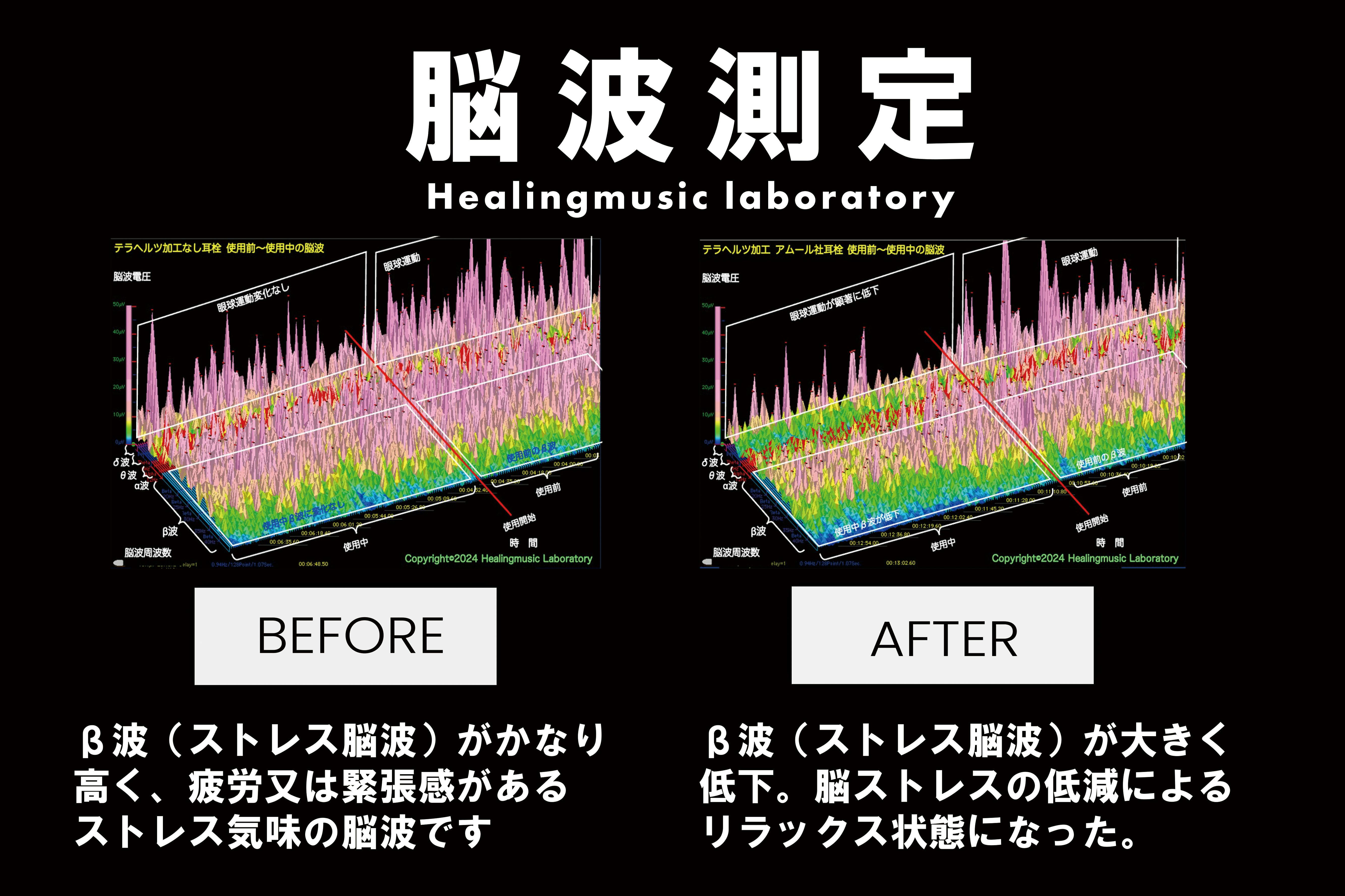 Healingmusic labotatoryで脳波測定を実施しました。使用前はベーター波が高く、疲労や緊張感があるストレス脳波でしたが、テクノロジーイヤープラグ着用、わずか2分でベーター波が大きく低下、アルファが発生し脳ストレスの大幅な軽減によりリラックス状態になりました。