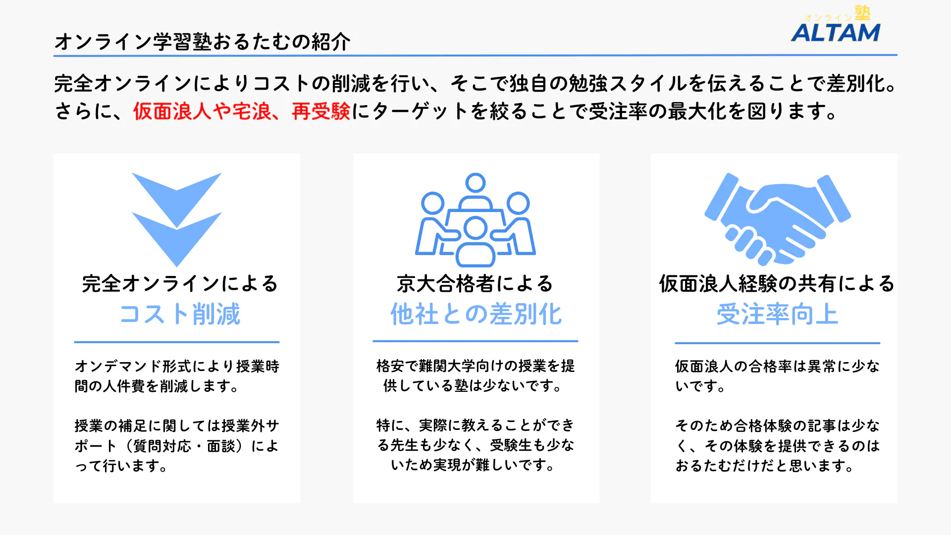 現在は勉強し直しの社会人の方が1名入会しています。やはり、安価で網羅的に勉強しているサービスの魅力は宅浪生さんや仮面浪人生さんに伝わりやすいと考えています。