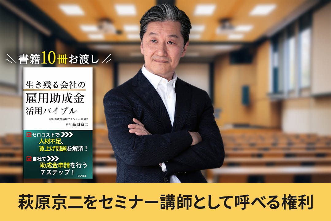 中小企業に正しい助成金の活用方法を伝える書籍「生き残る会社の雇用助成金活用バイブル」の著者萩原京二(はぎわら・きょうじ)をセミナー講師として呼べる権利です。 セミナーは対面で実施させていただきます。