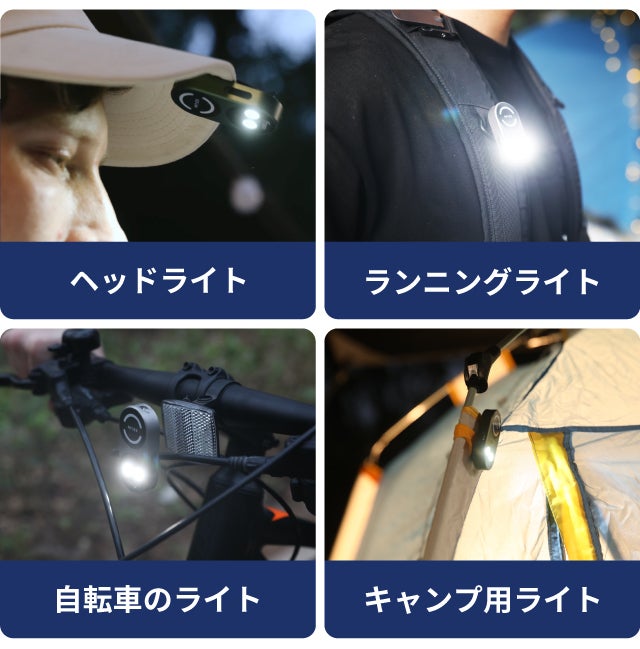 キャップのつばやベルト、自転車などどこにでも簡単に取り付けることができるのでアウトドアで大活躍します。