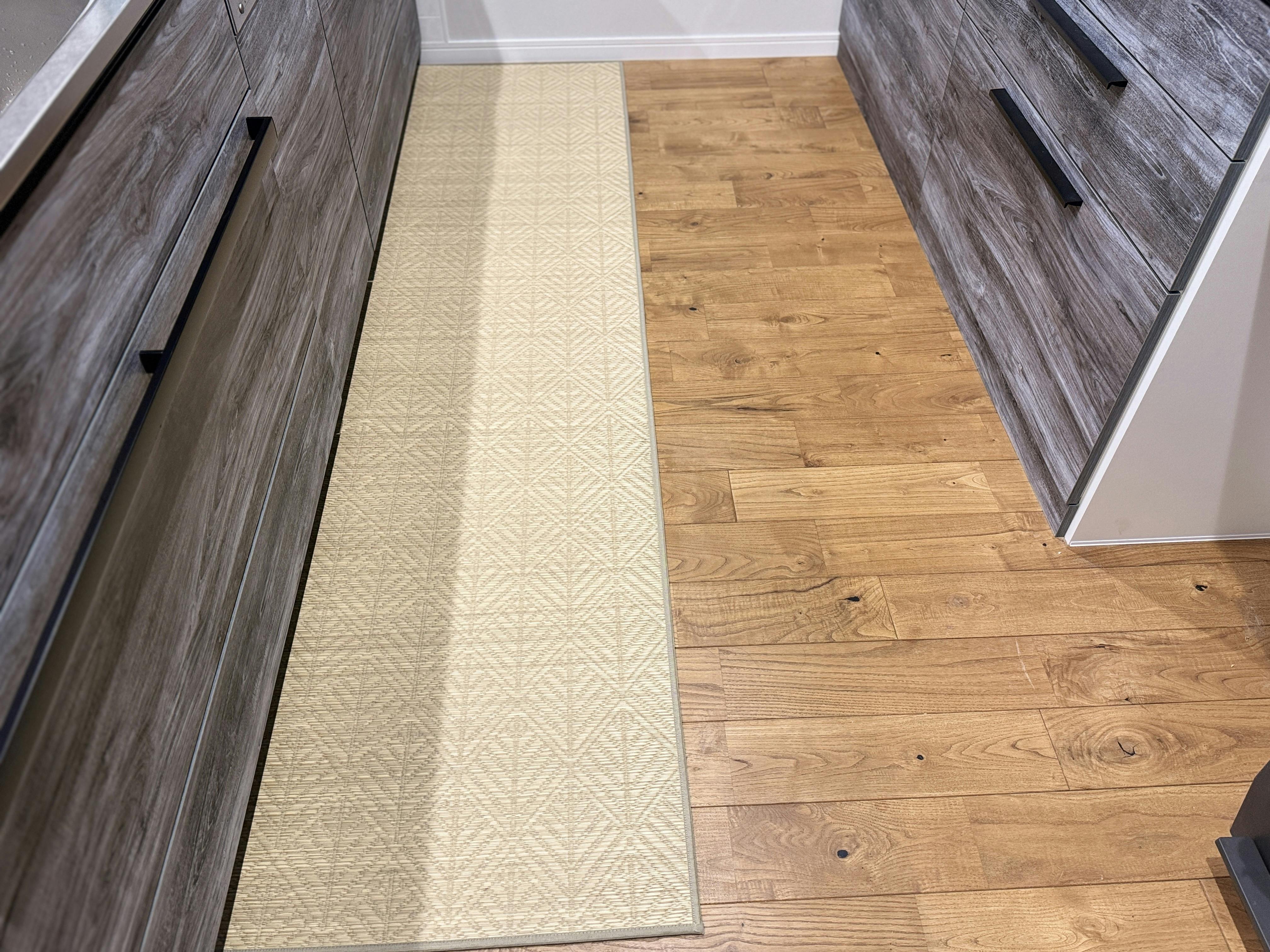 上の画像は、2025.1.15 22:00現在の自宅のキッチンです。去年の3月から240cmのナチュラルをずっと敷きっぱなしで使っています。料理の飛びハネや水回りの飛びハネはたくさんあったのに、目立ったシミになることなく綺麗で、お洗濯なしで清潔に使えています。普段のお手入れは掃除機掛けのみで、たまにキッチンマットをどかして床の掃除機かけをしています。床にもダメージありません。ぜひご参考ください。