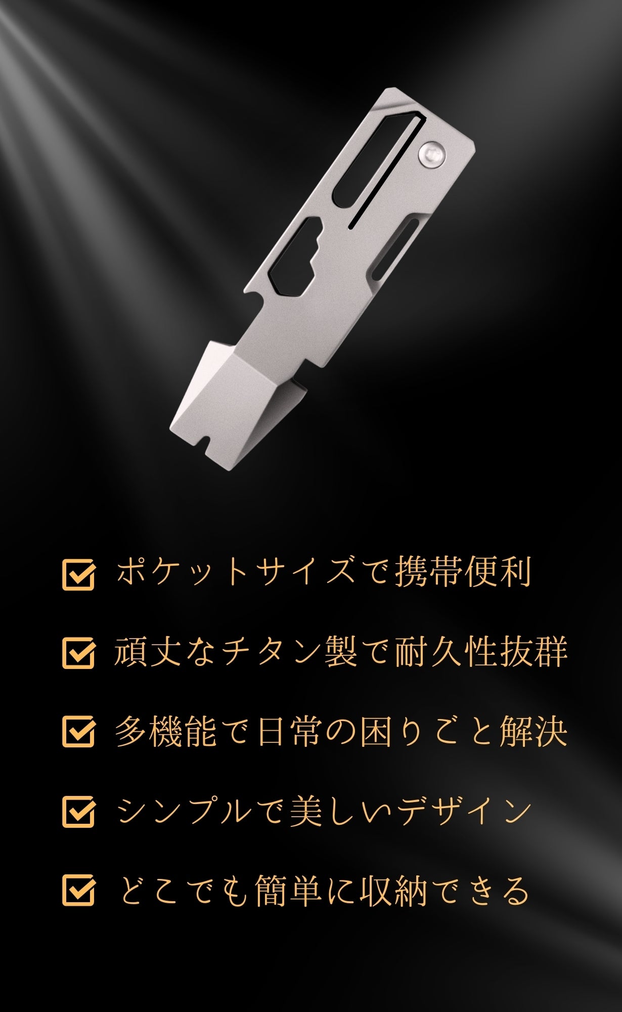 日常の小さな困りごとを解決するために、私たちはコンパクトで丈夫なチタン製EDCツールを開発しました。このツールはポケットやバッグに入れてもかさばらず、必要な時にすぐに使える多機能ツールです。これ一つで、カッターや枝切りナイフ、ドライバー、栓抜きなどの基本的なツールが揃います。収納スペースも節約でき、もう工具を探し回る必要はありません。