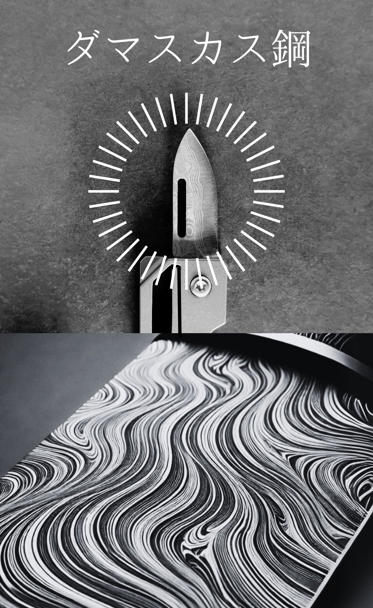 ボディには、耐久性と軽量性を兼ね備えたチタンを採用。過酷な環境でも使える強さを持ち、日常の持ち運びにも最適です。ナイフ部分には、美しさと実用性を両立したダマスカス鋼を使用。使うたびに感じる特別な存在感を、日常に取り入れてほしいという思いを込めました。
