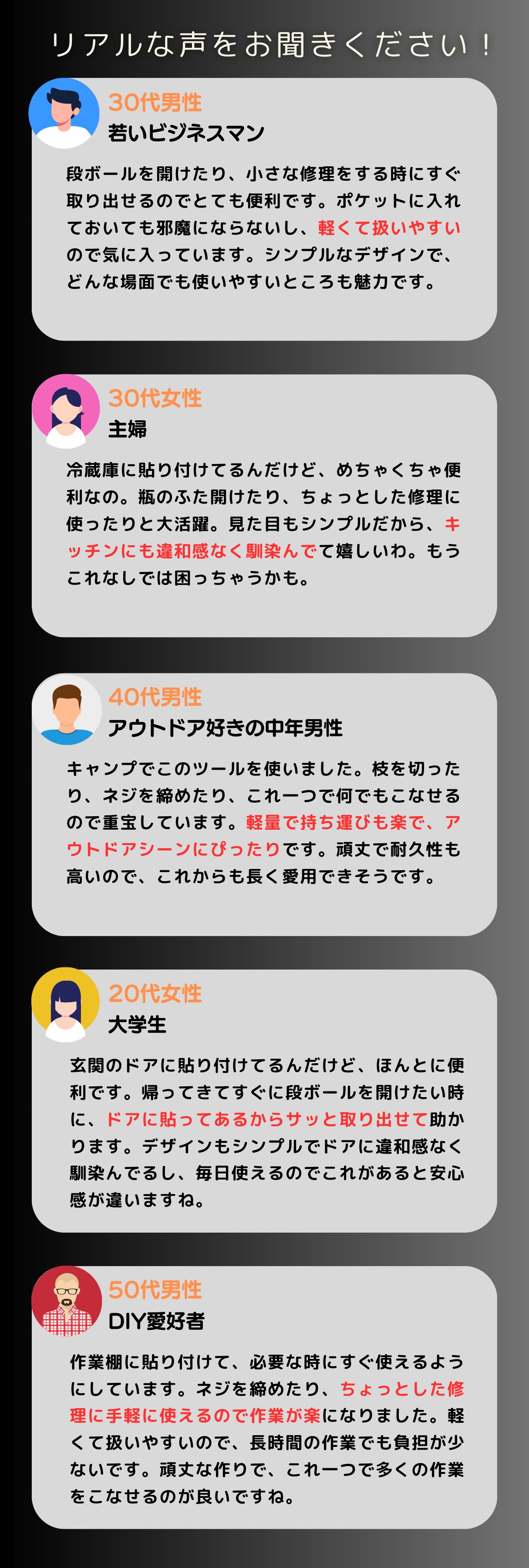また、マグネットキーホルダー(別売り)を利用すれば、玄関や冷蔵庫に取り付けて、いつでも手元にツールを置いておくことができます。こうして、私たちの製品は、日常の小さな困りごとを解決し、少しでも生活を楽にしてくれるパートナーとして生まれました。