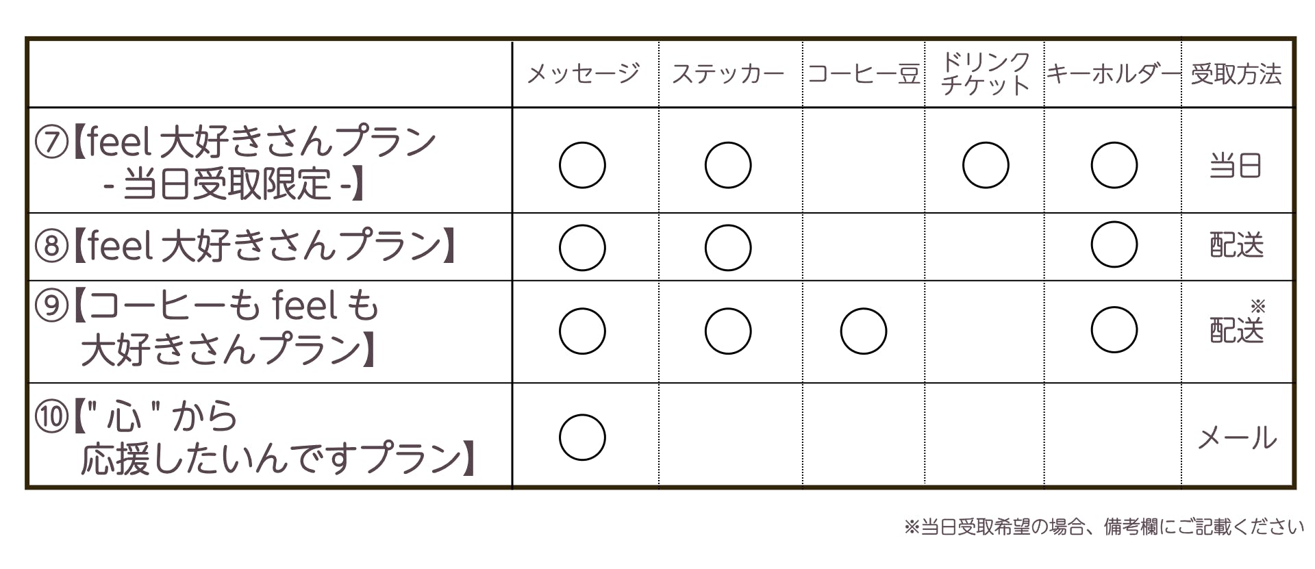 新たにオリジナルキーホルダーのリターンプラン『あとひと押しプラン』を作りました!キーホルダーデザインは、ご提供予定である⑦、⑧『feel大好きさんプラン』⑨『コーヒーもfeelも大好きさんプラン』と同じものとなります。