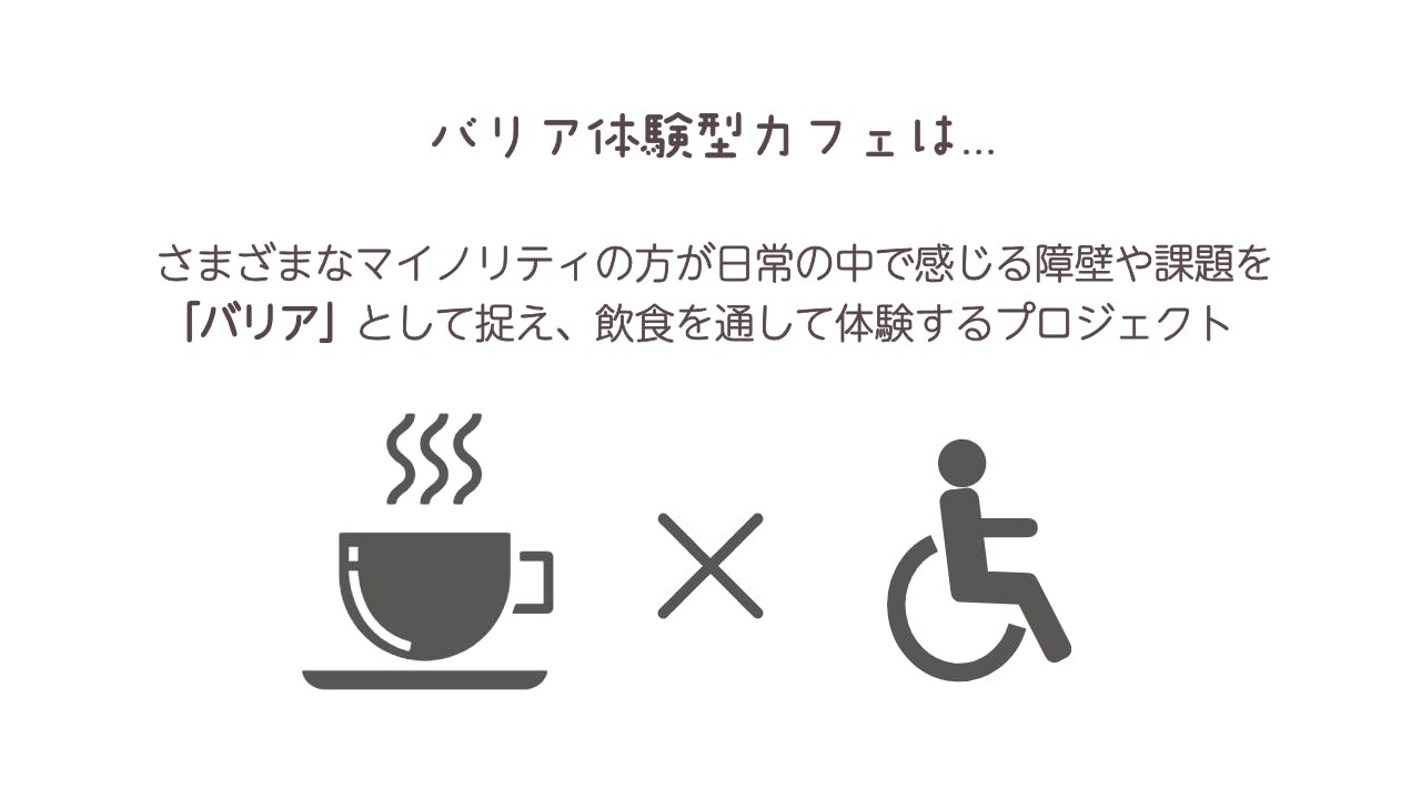 『バリア体験型カフェ』とは、さまざまなマイノリティの方が日常の中で感じる障壁や課題を「バリア」として捉え、飲食を通して体験するプロジェクトです。