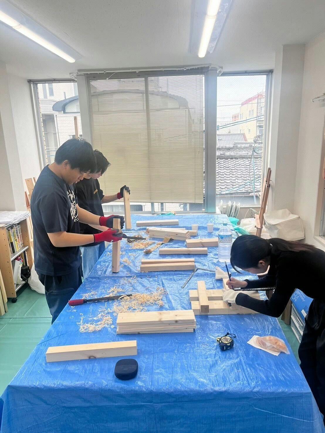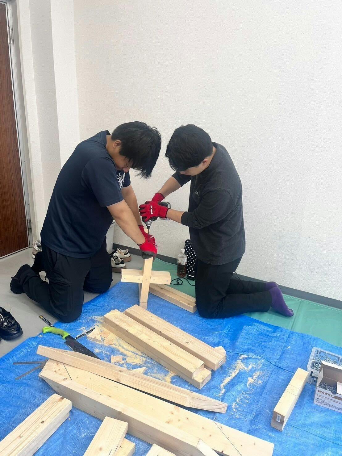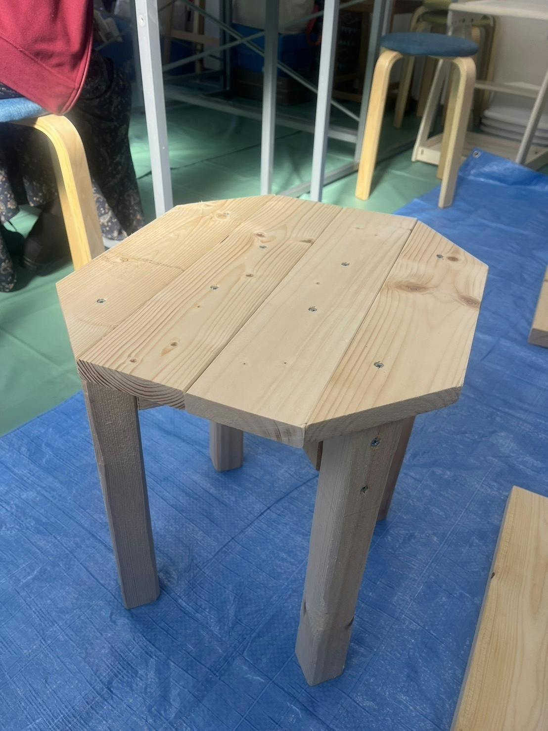 前回購入した木材をカットし、やすりをかけ、ビスを打ちました!前回同様、理工学部建築学科のお友達に協力してもらい作成しました。