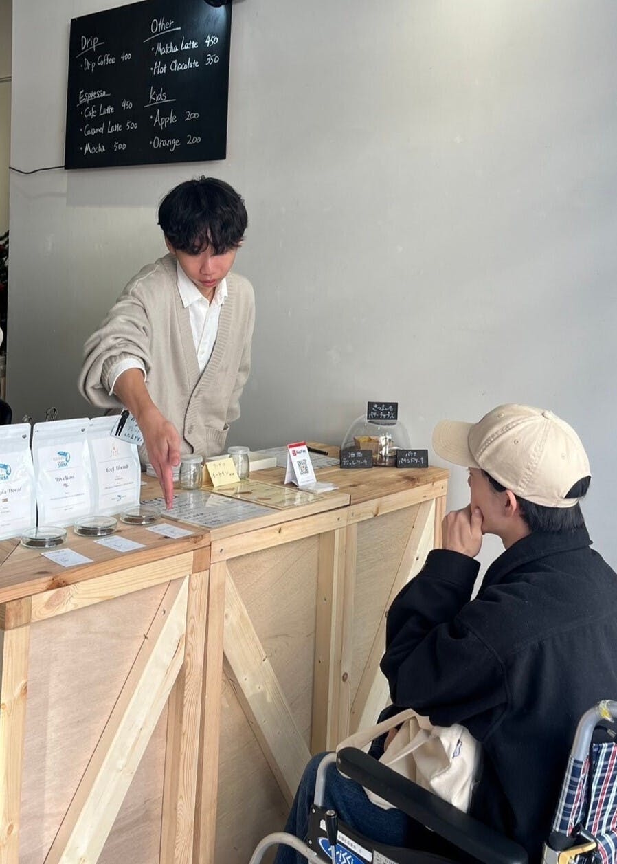 実際に来店されたお客様は、車いすに乗りながら注文、飲み物の受け取りを行っていただきました!