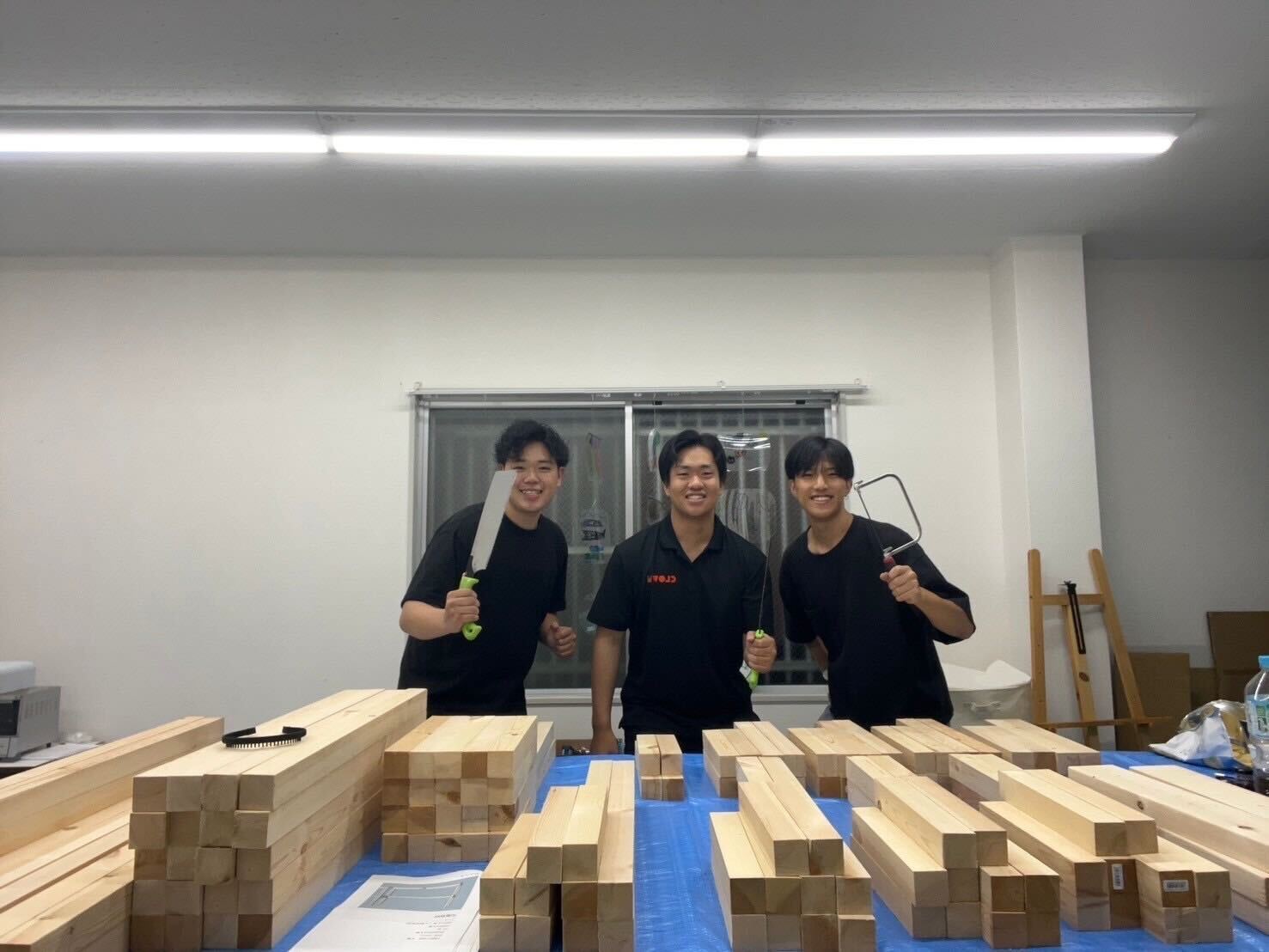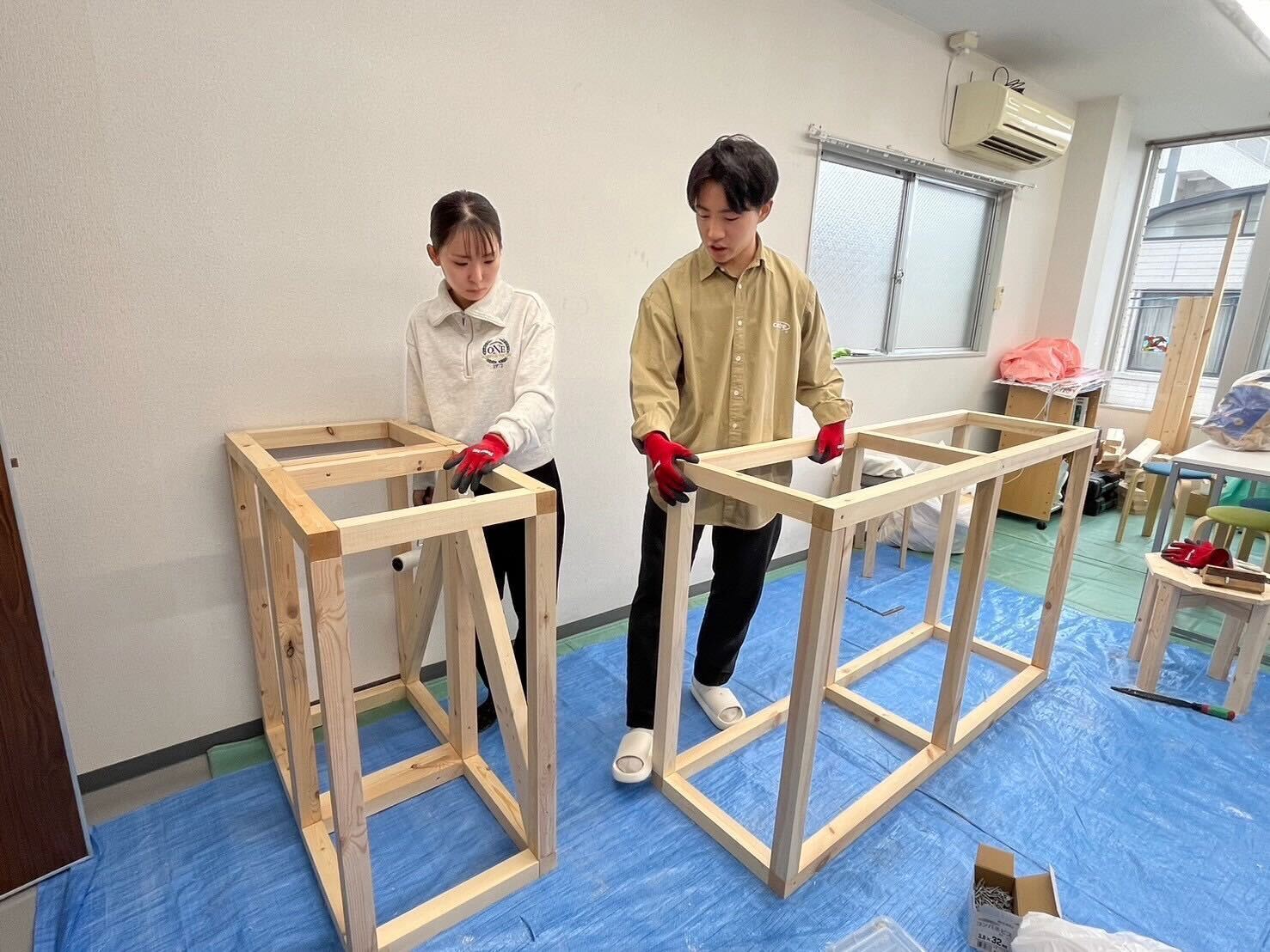 ご覧いただきありがとうございます。作業3日目となり、メンバーみんなも要領を掴んできました!どんどん製作スピードが早くなってます(笑)ハイテーブルで使うカウンターチェアは、前回作成した椅子と同じ構造で、統一感のあるものにデザインしました。作業するカウンターは、ある程度負荷をかけても崩れないように、斜めに木材を入れたりと工夫をしています。木材の端材も何かリメイクできないかと企み中です!お楽しみに!今後ともよろしくお願いします!