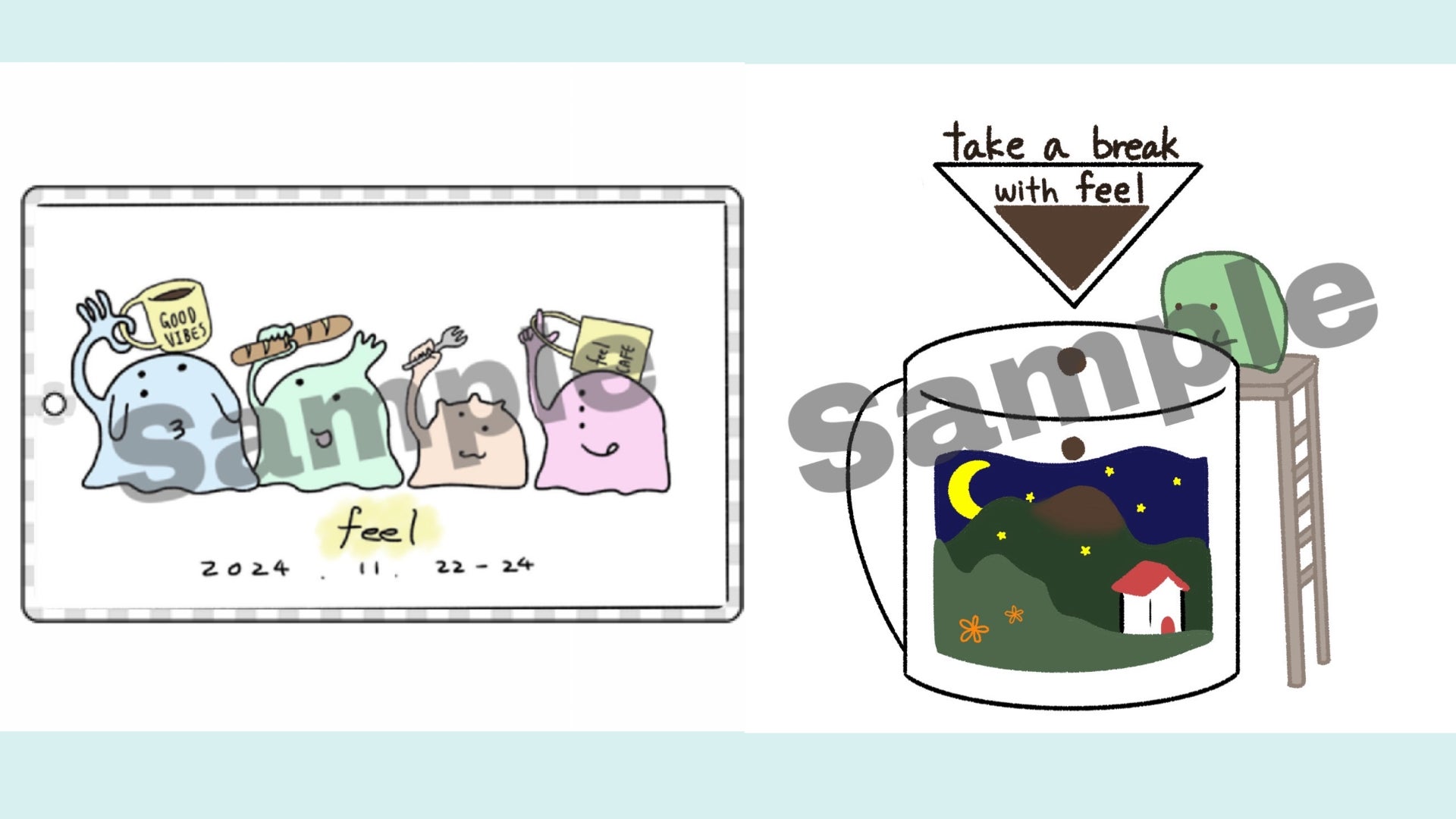 ご覧いただきありがとうございます!遂に……ステッカー、キーホルダーのデザインが完成しました!これまでにfeelのロゴやTシャツをデザインしてくれた大学の同じゼミの友達が協力してくれました。キーホルダーでは、スライムを描き、形にとらわれないことを表現いたしました。また、スライムの目の位置や、指に注目していただきたいです!指文字や、点字で何かを表しています。ぜひ何か考えてみてください!実は,,,スライムの手は指文字、目は点字で「feel」を表してくれています。次にステッカーでは、feelというフィルターを通して新しい世界を見てほしいという気持ちを表現しました。また、「take a break with feel」には、休むという意味のほかにも、feel cafeを通して価値観を壊すという意味も込められています。どちらもメンバーのこだわりや、考えが詰まったデザインとなっているので、ぜひ実物を見てみてください!!