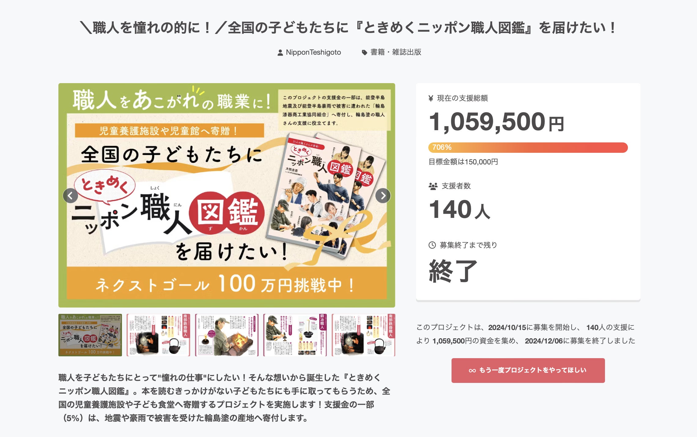 職人を子どもたちにとって”憧れ”の仕事にしたいという想いから新刊『ときめくニッポン職人図鑑』が誕生し、全国各地の子どもたちへ、そして、本を読むきっかけがない子どもたちにも届けたいという想いからスタートしたこのプロジェクト。
