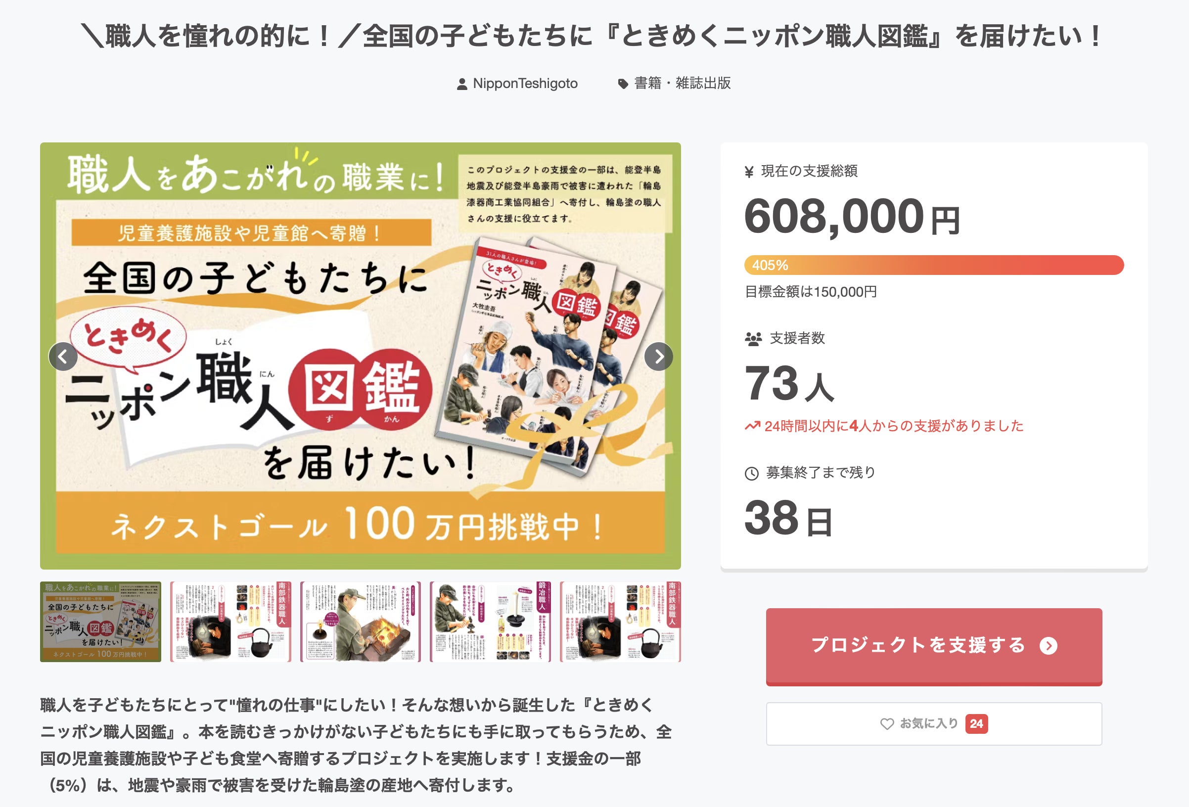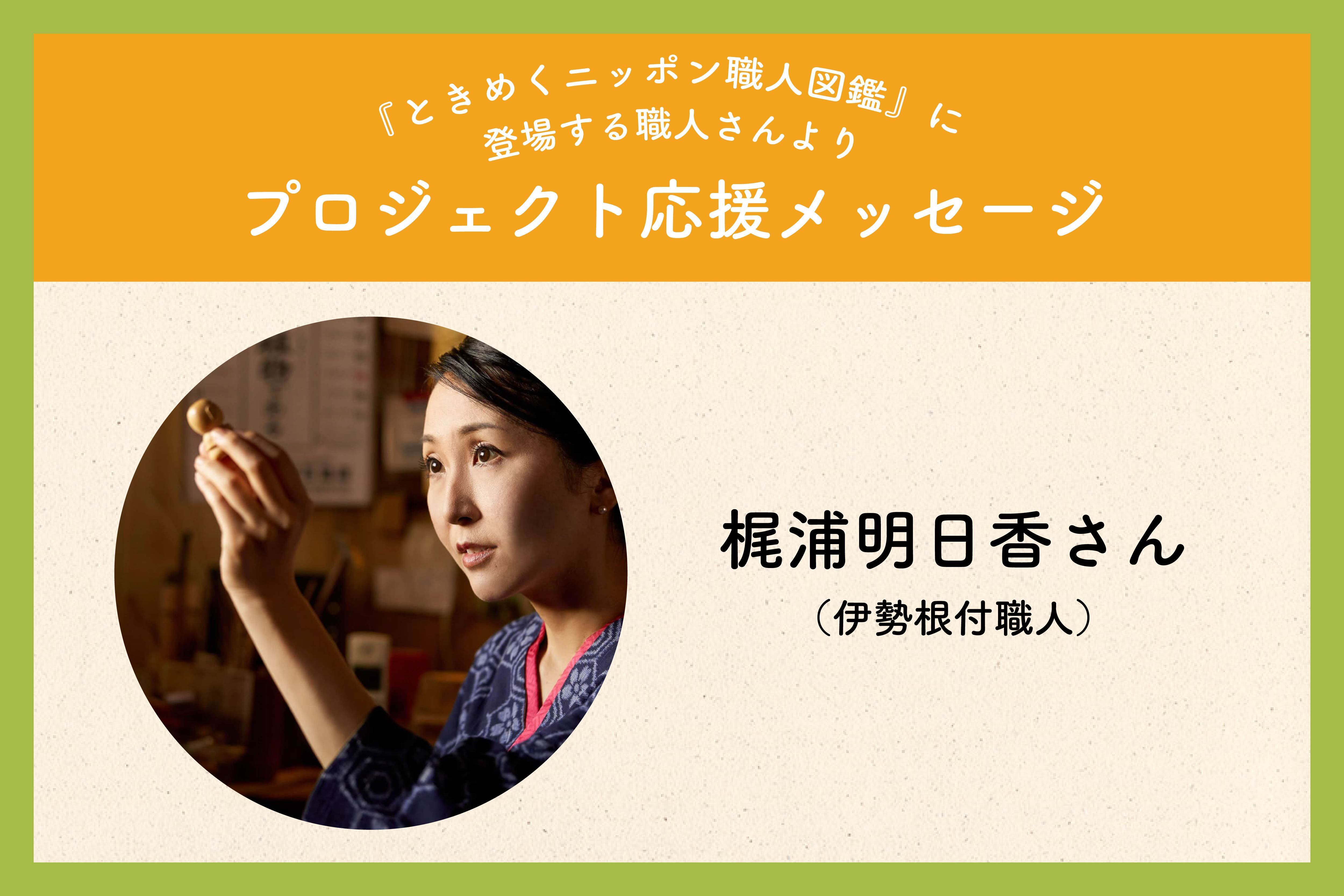 \職人さんからの応援メッセージをご紹介!vol.3/こんにちは、ニッポン手仕事図鑑です!今回のプロジェクトでお届けする『ときめくニッポン職人図鑑』では、全国さまざまな分野の職人さんが31名登場します。今回登場いただいている職人さんからこのプロジェクトへ応援メッセージが届いているので、ご紹介いたします!==============================梶浦明日香さん(伊勢根付職人)日本人で良かったなぁ!この本には、日本人が歴史の中で大切に守ってきた知恵や思いが詰まっています。一つ一つの工芸をそれぞれ知っていくうちに、今よりもっと日本人であることを誇りに思える本です。そんな本を子供達に届けたら、日本の未来も少し変わるかもしれません。==============================現在、達成率は400%を超え、76名もの方にご支援いただいております。ご支援、ご協力いただいた皆さまには感謝してもしきれません…!全国各地のさまざまな子どもたちが”本を購入する”というハードルを乗り越えるのは、安易なことではありません。子どもたちにとって、職人という仕事が将来の選択肢のひとつになるようにより多くの施設や地域に寄贈していきたいと思っています。ネクストゴールは、支援額100万・寄贈100箇所!全国には、児童養護施設や子ども食堂などの施設が1000箇所近く点在しているので、このゴールでもまだまだ多く及ばないですが、職人さんや子どもたちのために私たちができることを全力でやり切りたいと思っています!そのためにも皆様のご支援やご協力は何よりの力になります…!拡散や応援だけでも大変励みになりますので、お力添えいただけたら嬉しいです☺次回の応援メッセージは、畳職人の山田憲司さんです。お楽しみに!