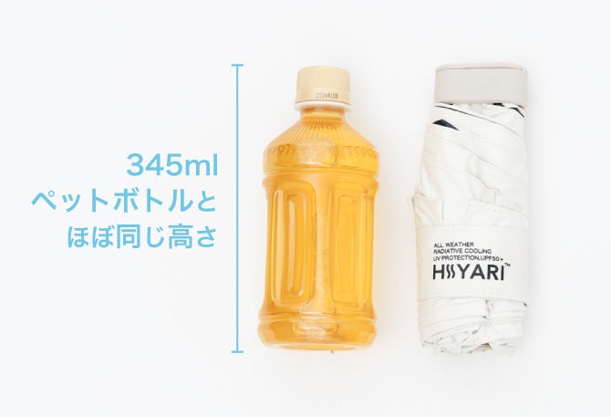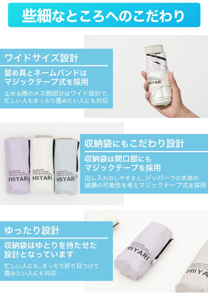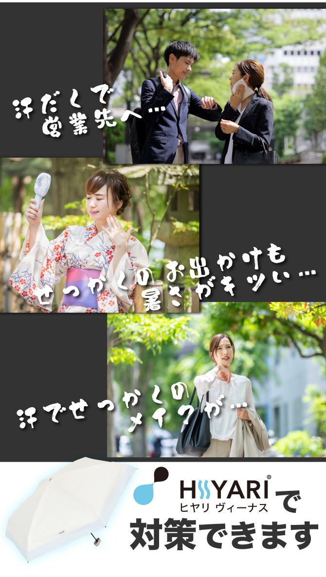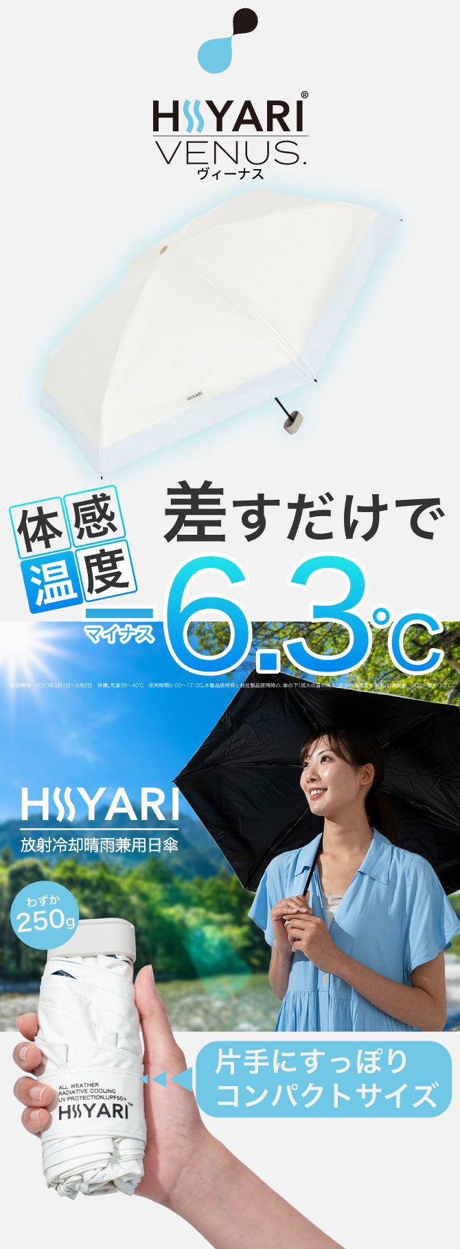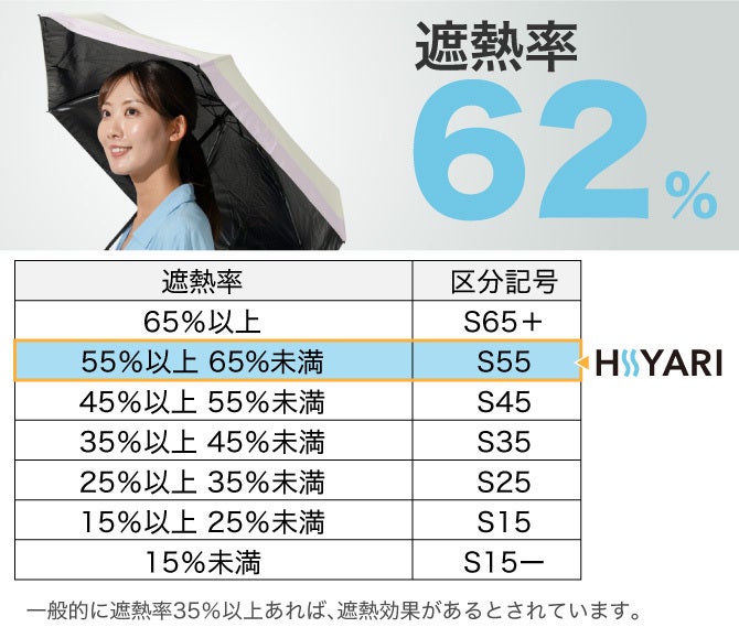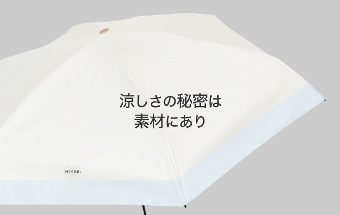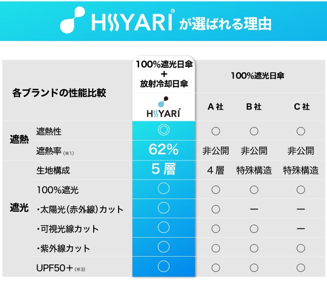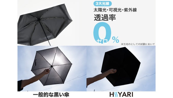 ※1 一般財団法人カケンセンターの遮熱性実験(JIS L 1951)にて、一部の他社「完全遮光日傘/100%遮光日傘」よりHIYARI®︎が優れた遮熱効果があることを比較立証済みです。