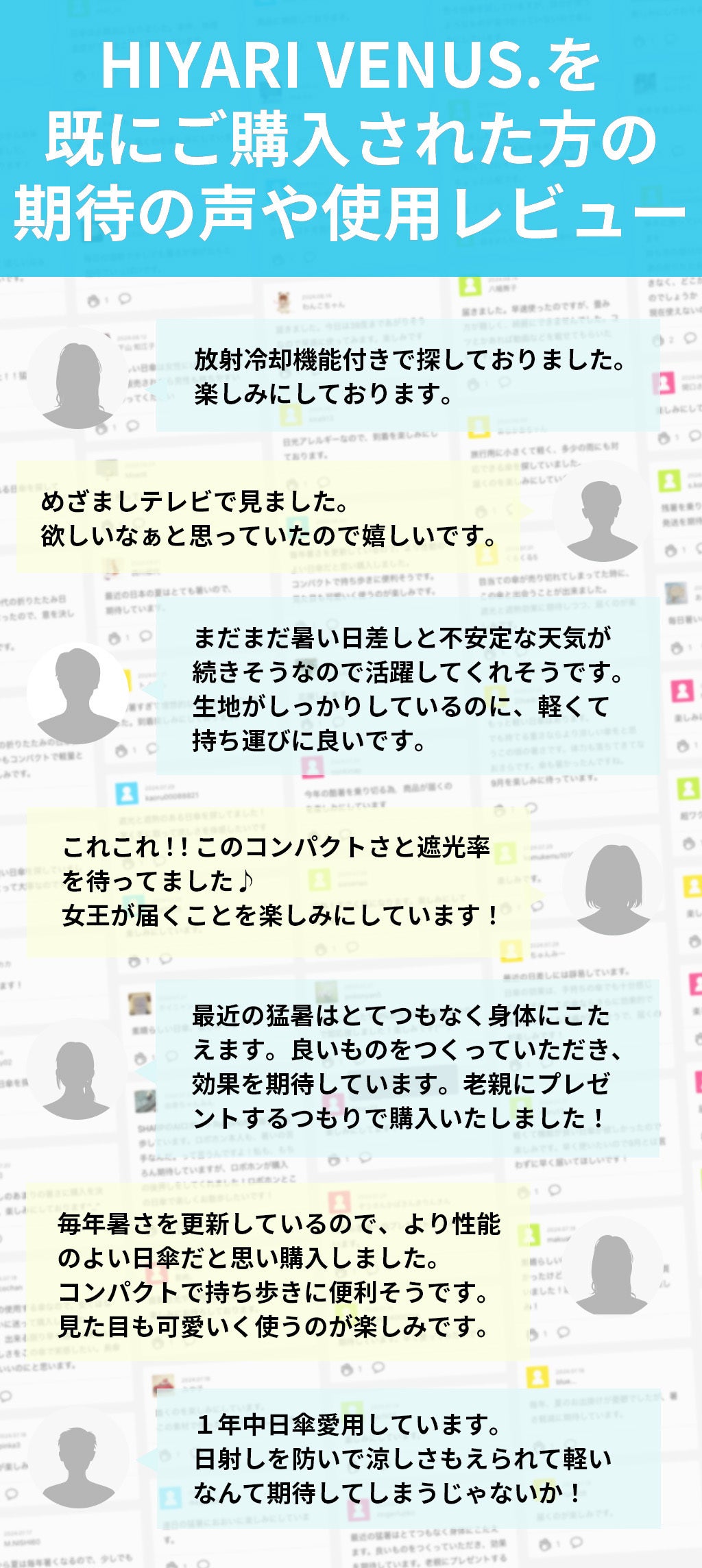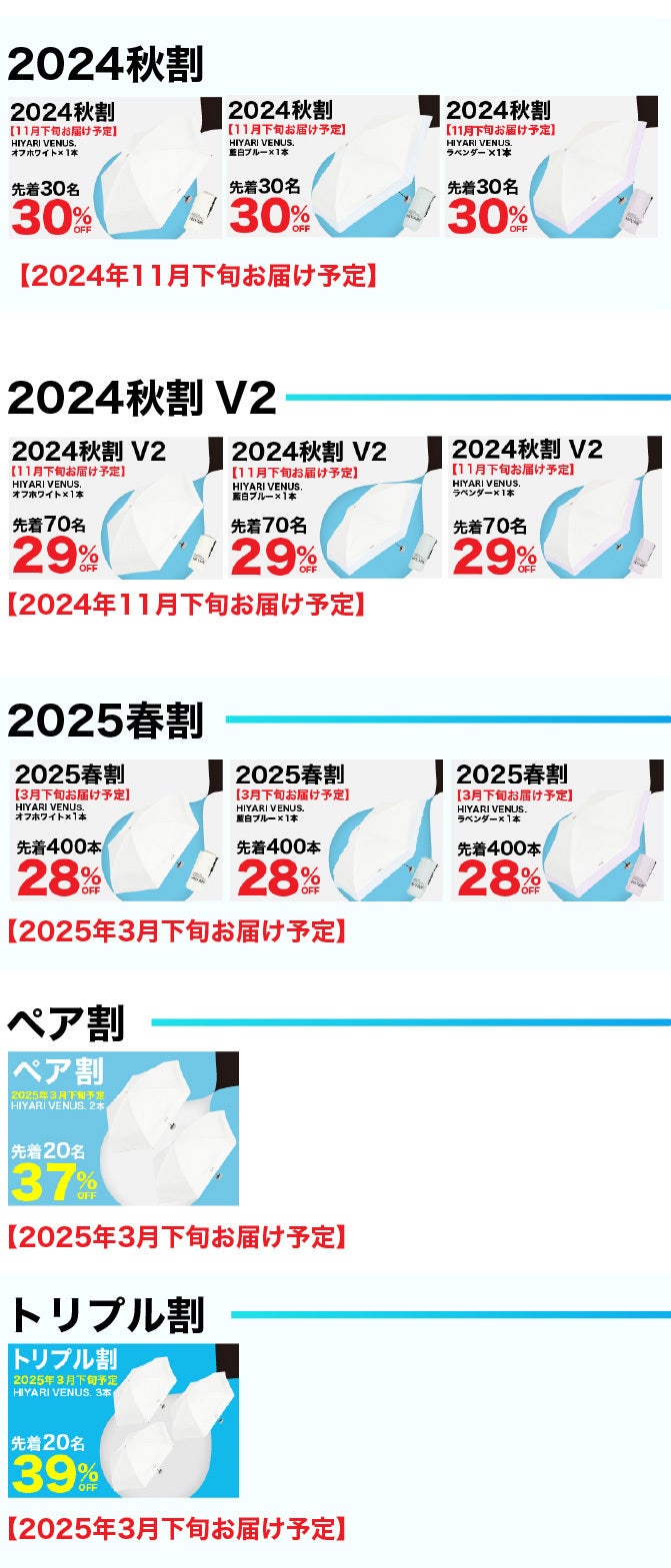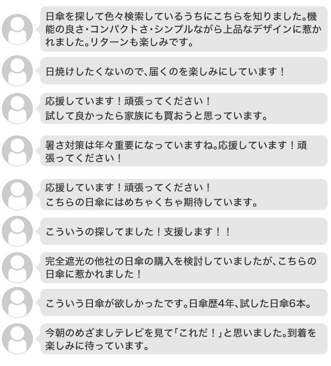 2024/11/28 14:16HIYARI VENUS.をご支援いただいた会員様へこんにちは。プロジェクトは昨日をもち、完了いたしました。お蔭様で、本日より、順次配送する運びとなりました。早期出荷にご理解とご協力いただき、ありがとうございました。早めのお受け取りをお願いいたします。以下、ご案内させていただきます。【今回の配送対象】ご支援頂いた全ての会員様(ペア割・トリプル割含む)【配送代行】兵庫県の株式会社Ra・Mu様に配送を委託しております。【運送会社】ヤマト運輸様【注意事項】長期間お受け取り頂けない場合は、配送代行会社様に商品が戻ります。その後の再配送の際、配送料「着払い」での再配送とさせていただきます。どうぞ、早めのお受け取りをお願い申し上げます。配送に関するご案内は以上です。万が一、初期不良やお気づきの点がございましたら、同封のレターに記載の「夢工房」様へお問合せください。修理部品・交換品をご用意しております。※弊社にお問合せを頂いても対応できかねますので、あらかじめご承知おき下さい。同封のレターには、傘の開閉方法、生地の折りたたみ方法をご紹介した、動画のQRコードを掲載しております。傘をご使用になる前にご確認くださいますよう、お願いいたします。【HIYARI VENUS. 開閉方法】https://youtu.be/u6UmckJOqfU【HIYARI VENUS. 折りたたみ方法】https://youtu.be/i757QelGZY4■HIYARIの今後について現在、公式HPのリニューアルの準備を進めております。https://hiyari.jp/リニューアル後はHPから製品をお求めいただけるようになります。また、CAMPFIREでご支援いただいた方に、今後もお得にご購入頂けるような施策なども検討しております。ご協力を依頼させていただくこともあるかと存じますが、その際はどうぞよろしくお願いいたします。また、皆様のご意見を踏まえ、より良い製品作りに一層努めます。並行して、生産委託体制の見直しも進めております。今後、国内ECモールでの販売予定に加え、海外プロジェクトなどの構想もございます。今回の配送を持ちまして、プロジェクトは完了となりました。本当にありがとうございました。引き続きどうぞよろしくお願いいたします。 もっと見る本日はプロジェクト最終日です!