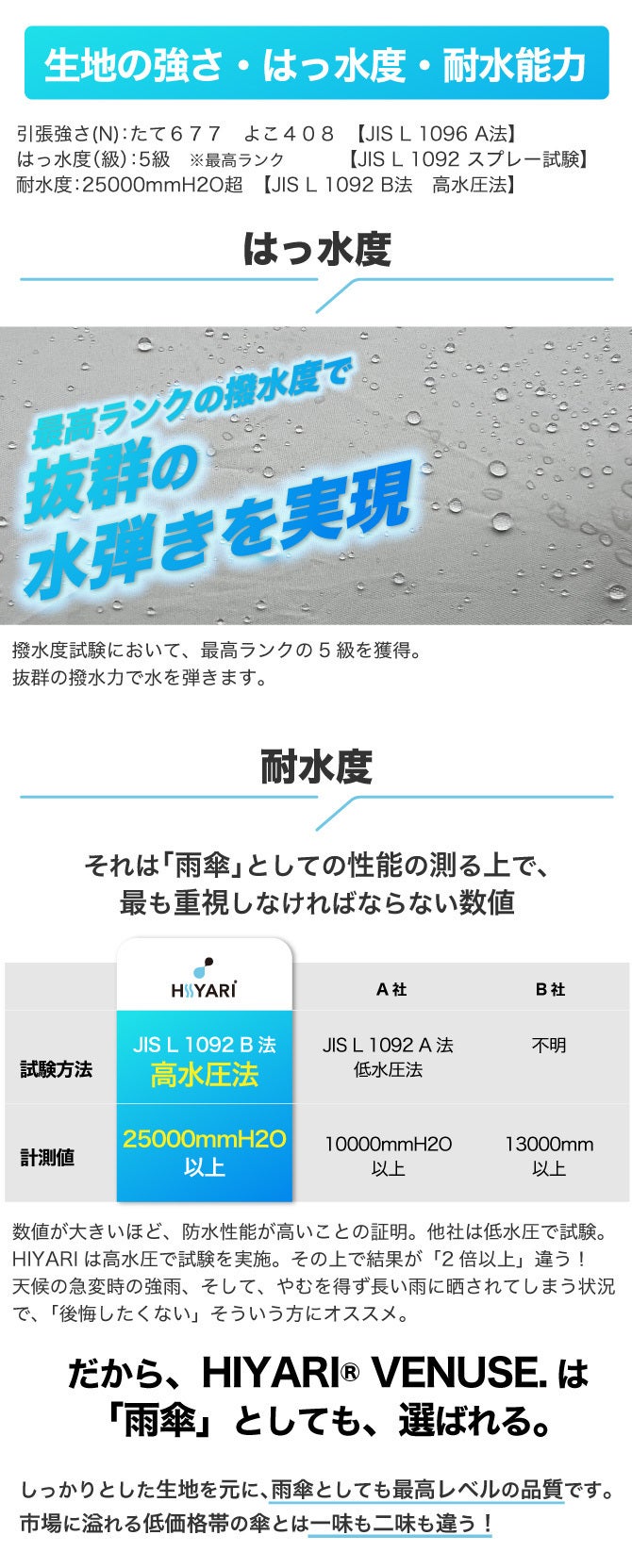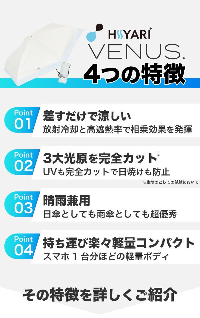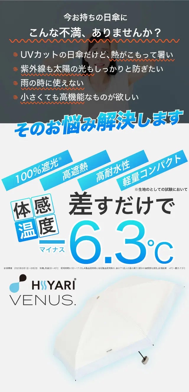 HIYARI VENUS.は完全遮光日傘。太陽光、可視光、紫外線の3大光線の透過率トリプルゼロを実現!第3者検査機関において認定を受けた正真正銘のトリプルゼロ日傘です。