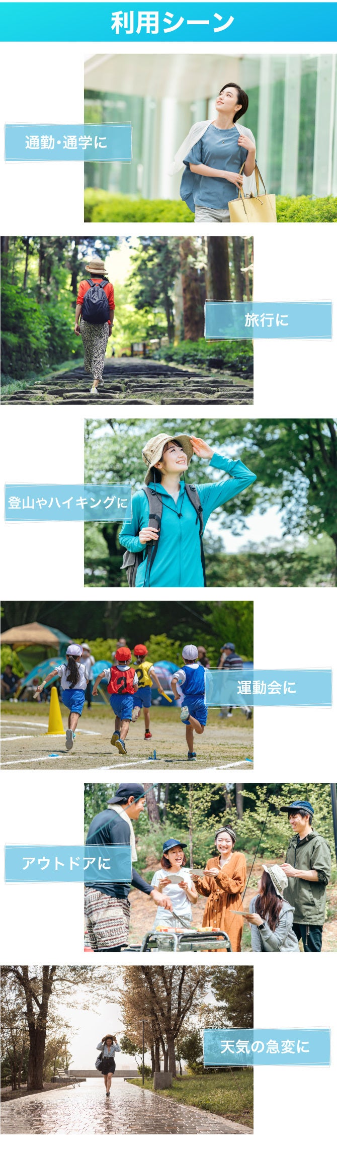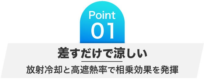 ⚫計測環境 2020年8月1日~8月2日 快晴。気温38~40℃ 使用時間9:00~17:00。本製品使用時と他社製品使用時の、傘の下(成人の首の周り)部分の温度差を測定。計測結果 -4℃~最大-7.5℃