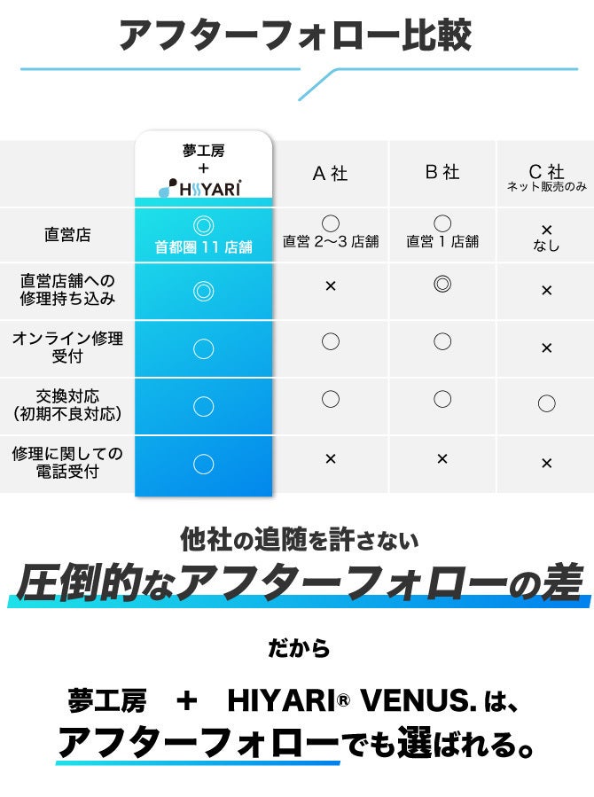 夢工房様に晴雨兼用日傘HIYARI®のアフターフォローを委託いたします。大手傘メーカー様や大手百貨店様と同等レベルのサポート体制となりました。不安なく製品をお選びいただけます。修理や部品交換が必要になった際は、夢工房様にお問合せください。オンラインでの全国対応、そして、首都圏には店舗もございますので修理品のお持ち込みも可能です。夢工房様のサポートとあわせて、末永く製品をご利用いただけますと幸いです。
