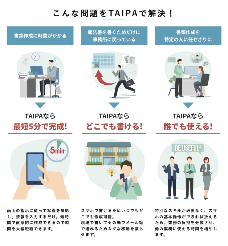写真を撮って報告する業務には手間をかけて事務処理を伴う作業が必要です。でも、報告書が事務員さん、写真撮影する作業員さんの重荷になってはいませんか?長年不動産業界に携わってきた私達だから聞こえていた事務員さん作業員さんの悩みを解消したいと思い、報告書作成アプリ「TAIPA」を開発致しました。
