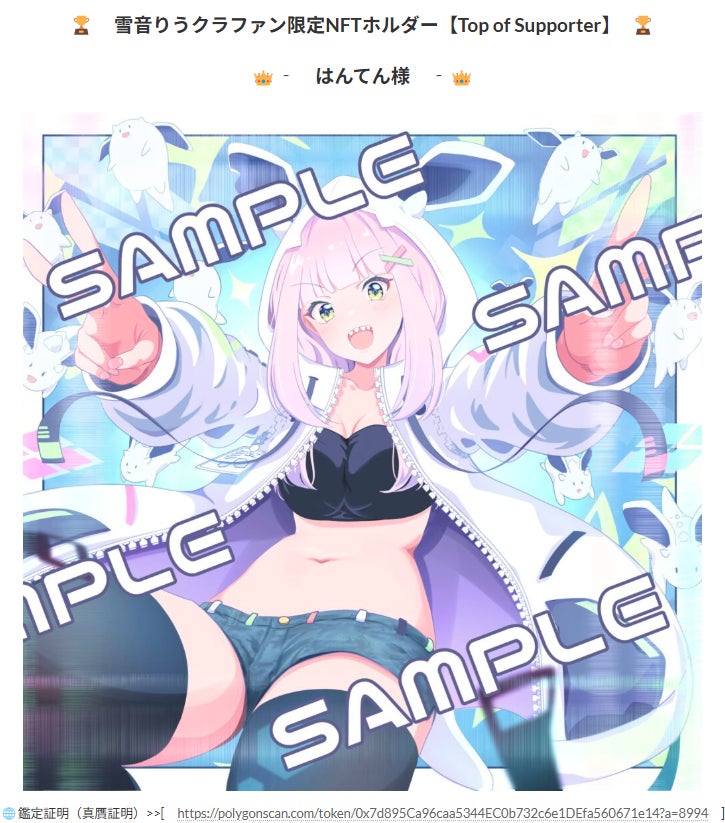 私信>>はんてんさまへ:この度は誠にありがとうございました。今後の雪音りうプロジェクトでは、雪音りうNFTホルダー様限定の次世代のプレミアムな体験もご提供してまいりたく思いますのでぜひ楽しみにしていてください!