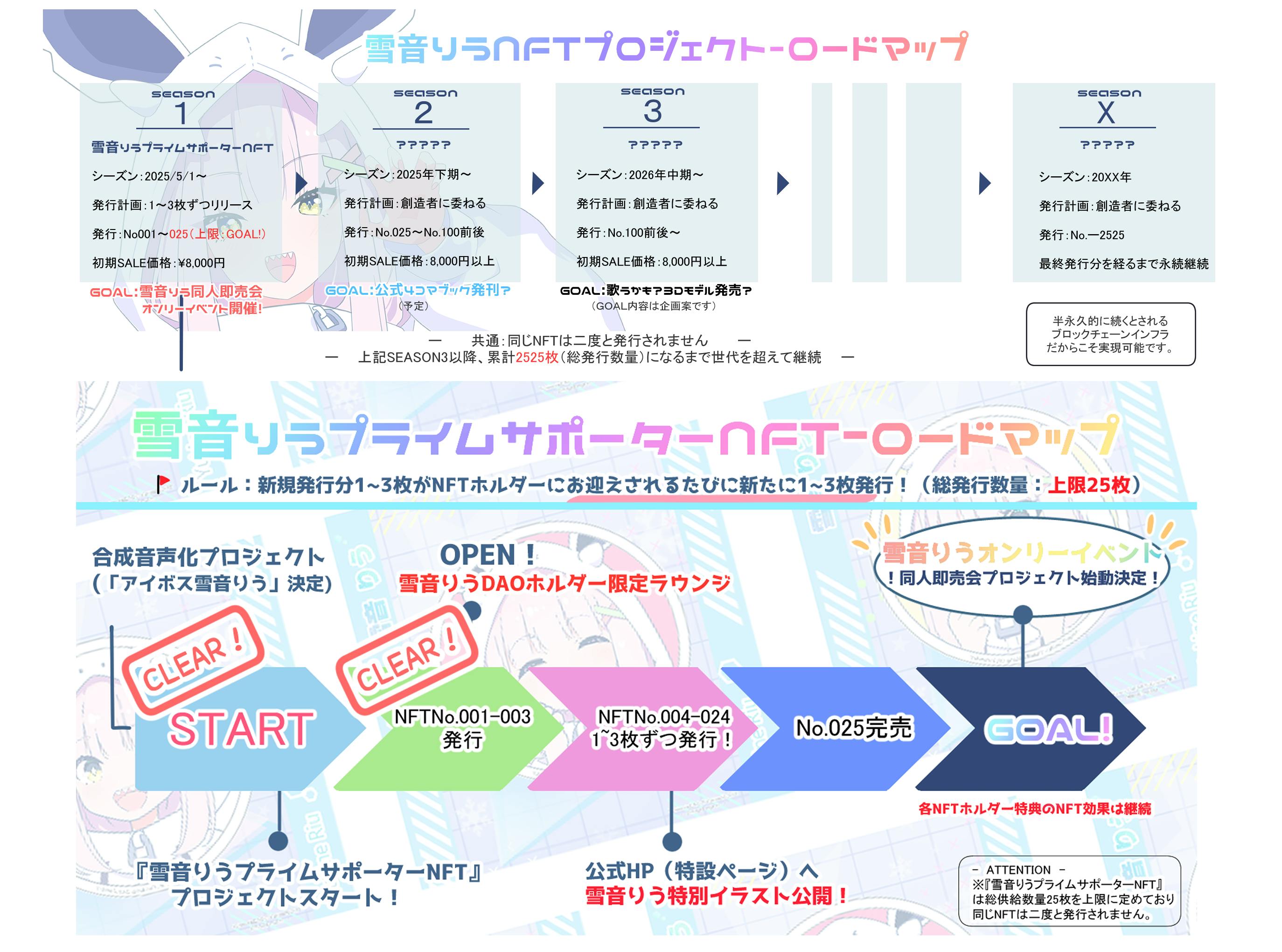 そうしてシーズン1のゴールである雪音りうオンリーイベントの企画がかなり現実味を帯びてきました。こちらも実施の際はイラストレーター/絵師のサークル参加組を募集します。雪音りうを含んでいれば出品するコンテンツに特に制限は設けない予定です。ほかのキャラクターとの掛け合いも大歓迎ですのでみなさまの思う「雪音りう」を描いてみてください。(まだ時期尚早ですがNFTホルダーさんがあと8名集まれば実現しそうです。)