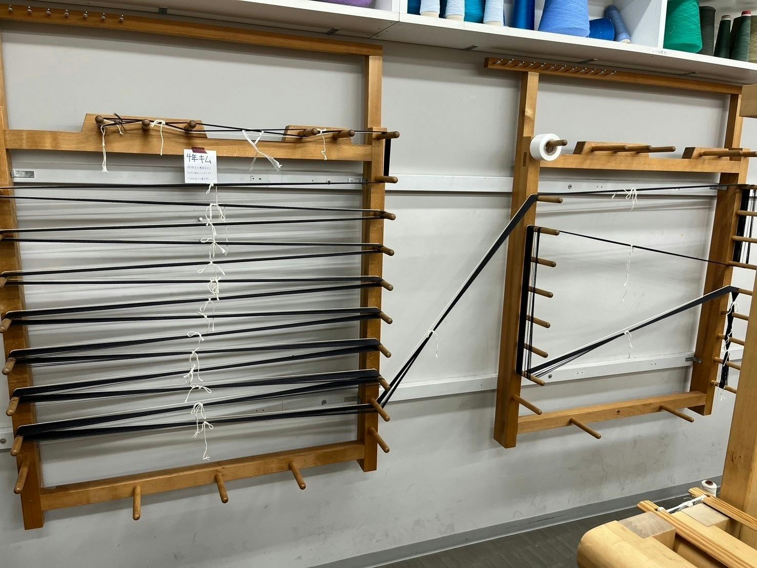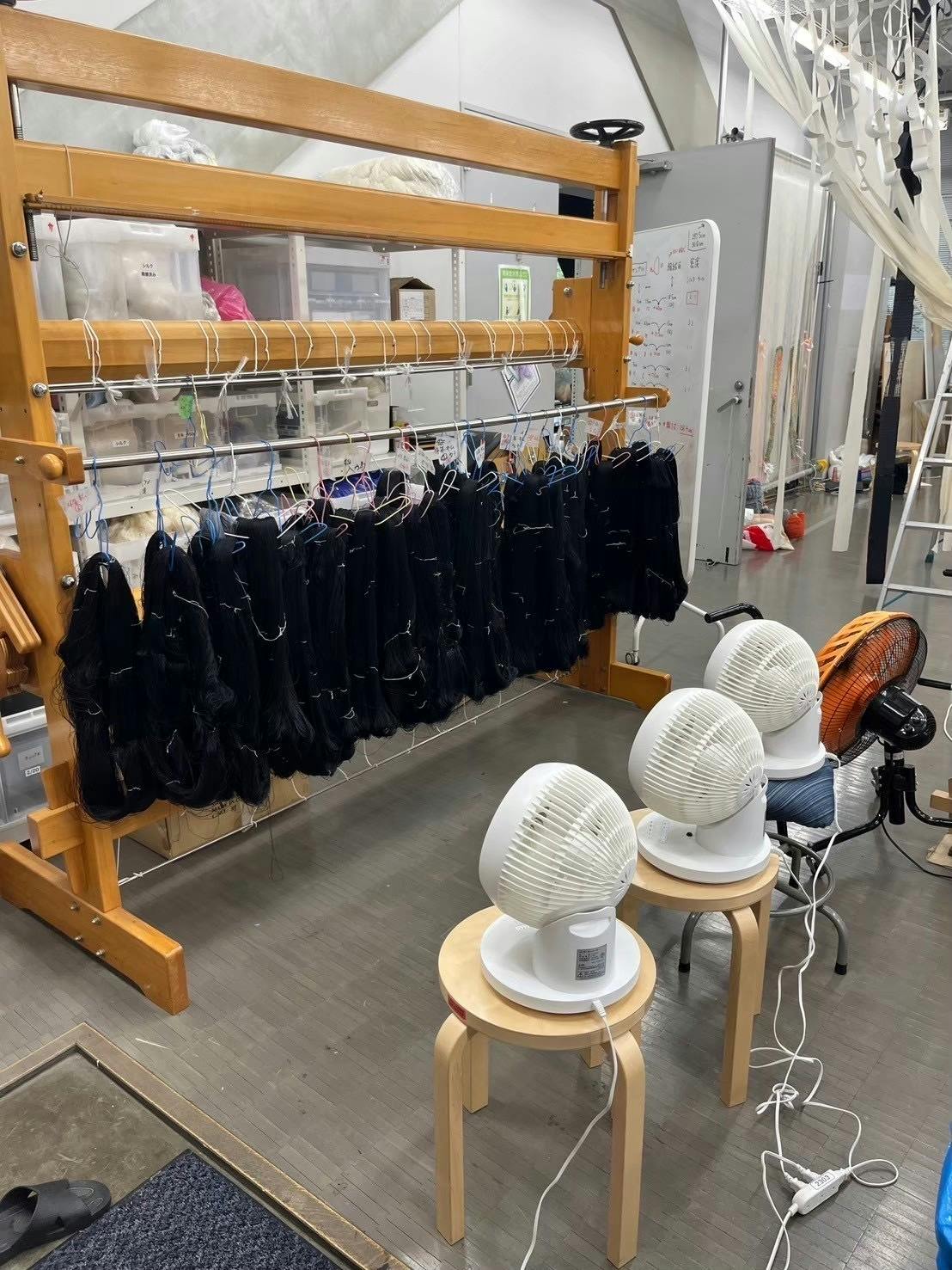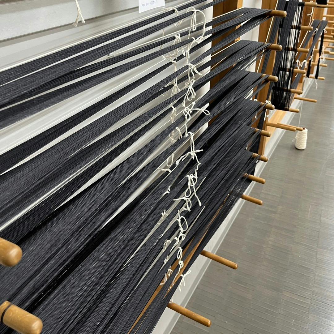 大量の糸を真っ黒に染め上げ、細長い織物を作り上げています.˚⊹⁺‧1,2枚目は、織物の経糸(縦方向の糸)を作っている様子です。
