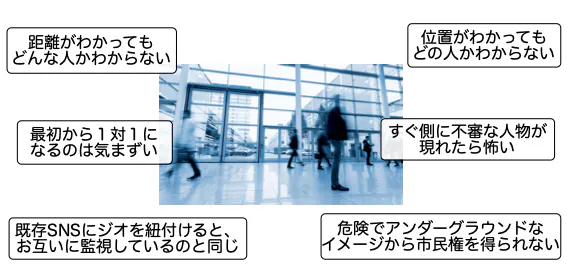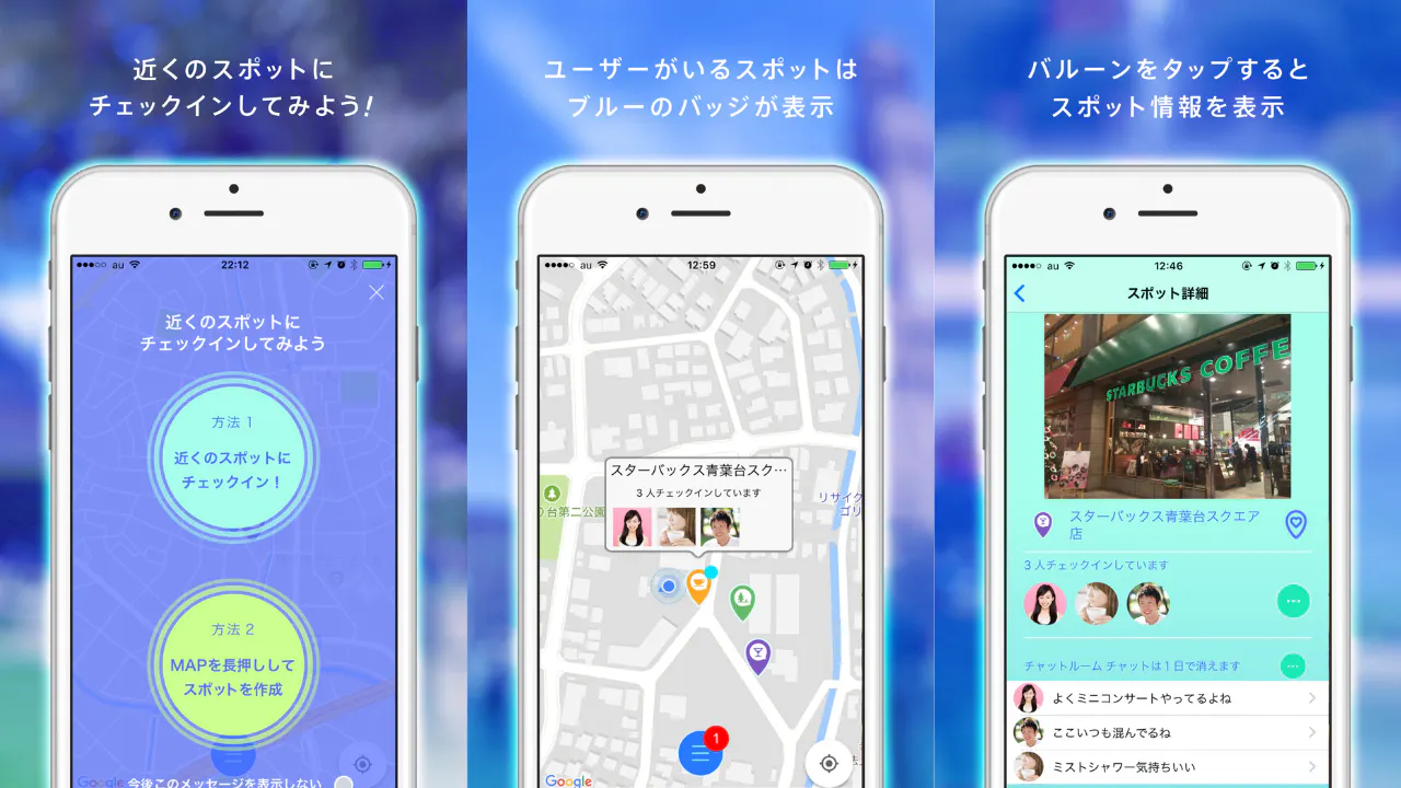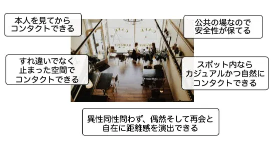 でもスポット(カフェ・教室・図書館・ジム・ライブハウスetc)にチェックインすれば、今誰が同じスポットにいるかわかりますし、どんな人かもわかります。