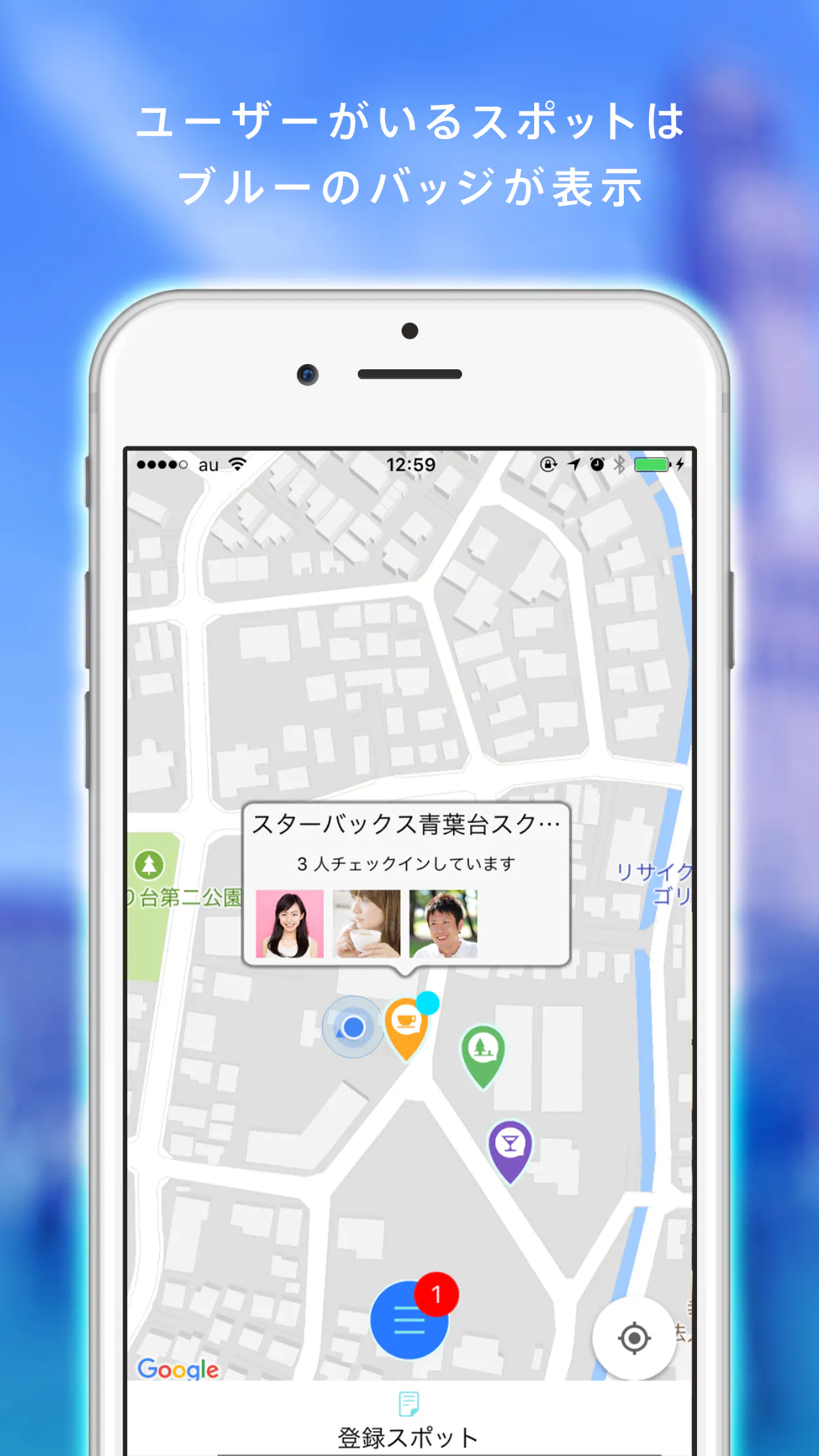 ・起動すると現在地周辺のMapにスポットと、チェックインしているユーザーが表示される