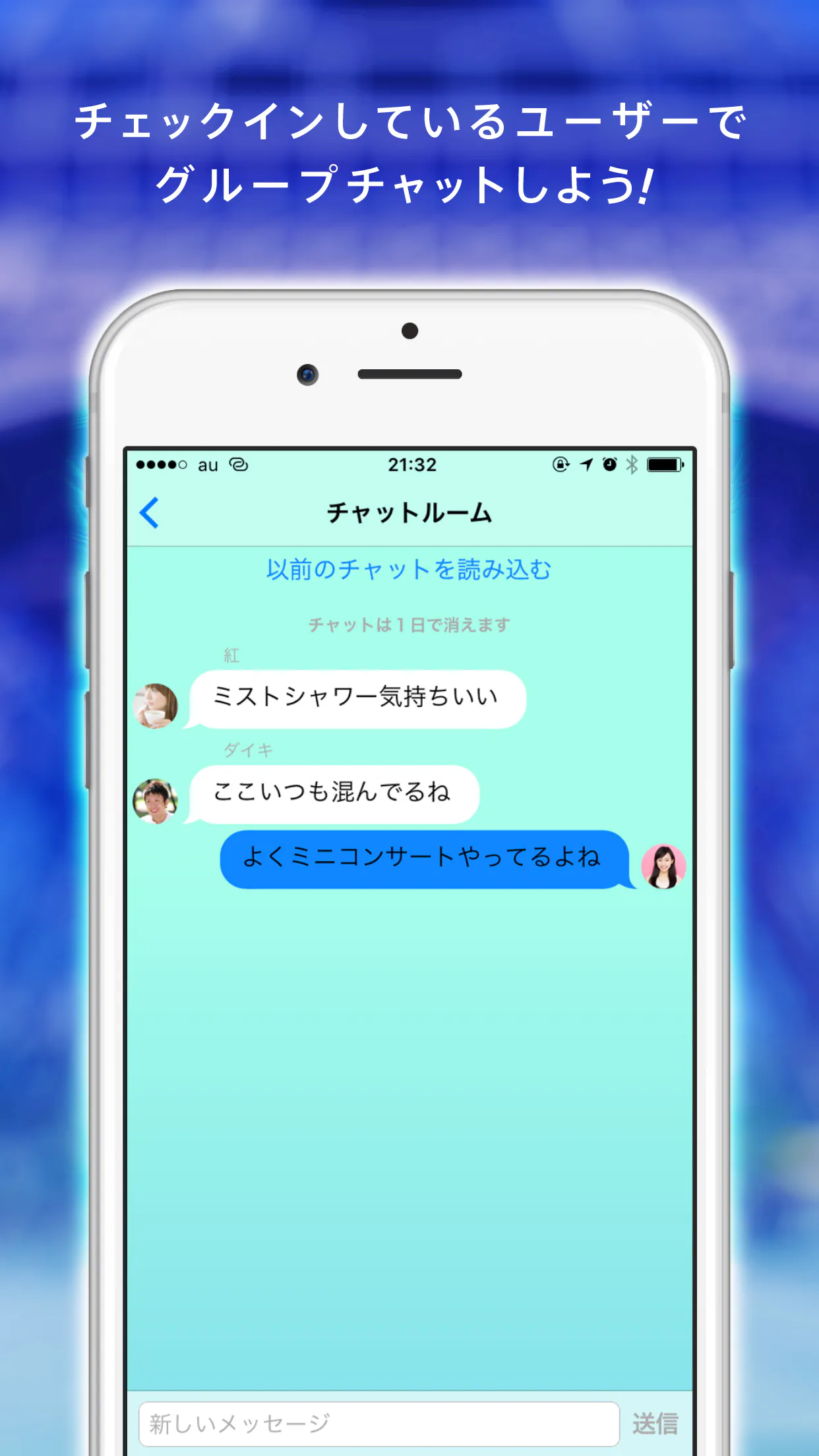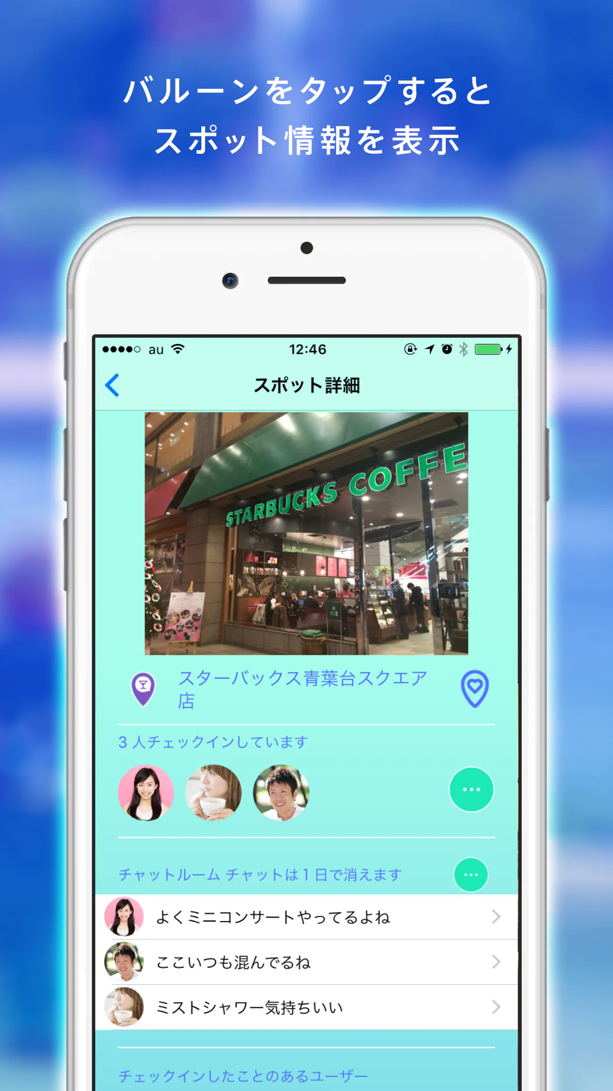 ・スポットをタップすると、スポット情報が表示され、チェックインしているユーザーとグループチャットや気になるユーザーとチャットできる