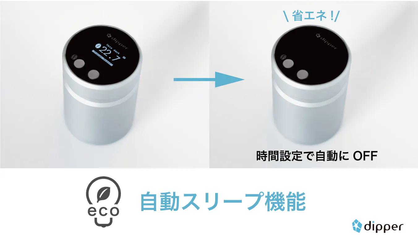 dipperには、自動スリープ機能が搭載されており、使用時に「電池が切れていた」という事態を防ぎます。操作を終了してからスリープに入るまでの時間は設定が可能。コーヒーの現場でありがちな消し忘れによる充電ロスを防ぎ、省エネ・節電にも配慮した設計となっています。