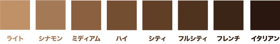 一般的な焙煎度の呼び名はコーヒーを専業としない方でも、お店などで一度は耳にしたことがあるかもしれませんが、「フレンチロースト」「シティロースト」等の焙煎度を示す呼び名のことです。