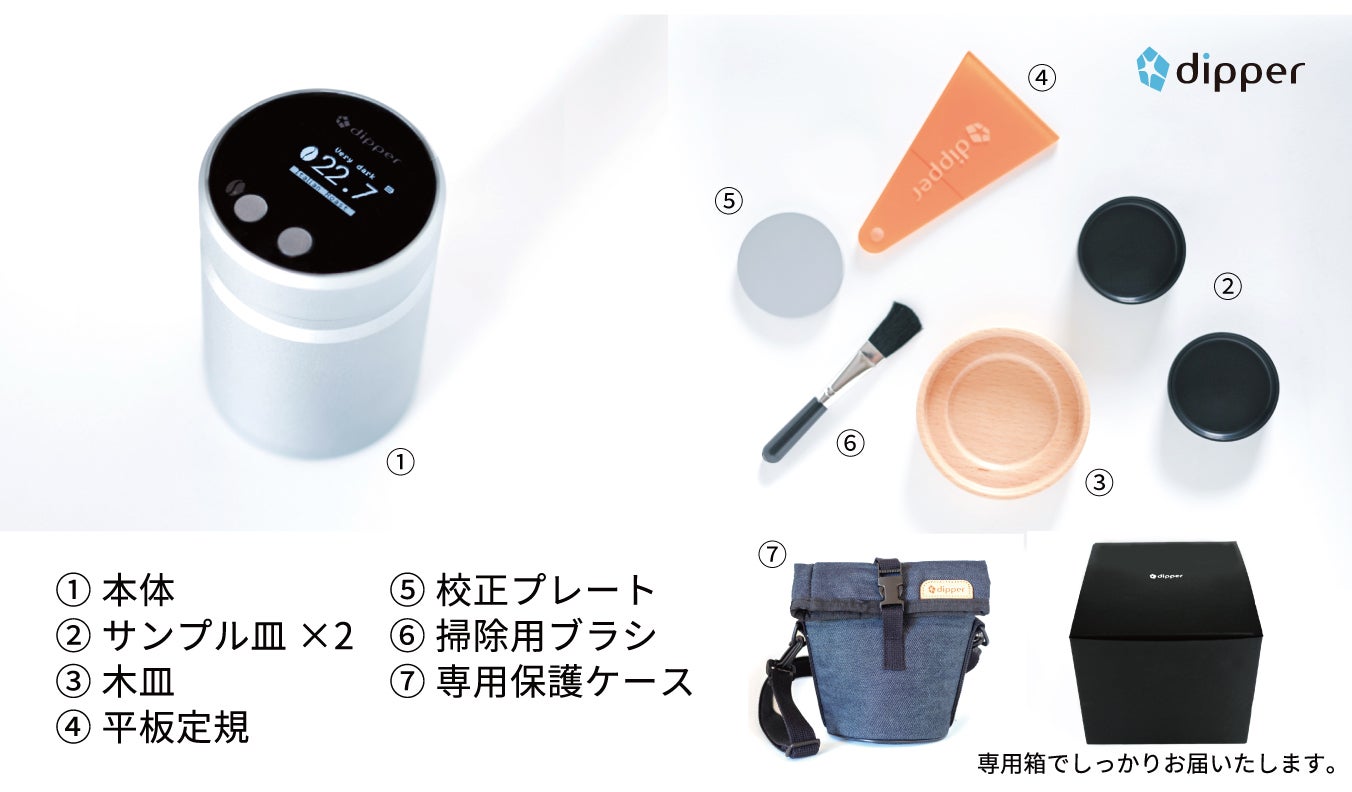 リターンの内容は以下のdipper本体、付属品一式、専用保護ケース、箱となります。