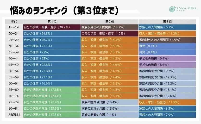 他の悩みの項目には、「家族との人間関係」や「お金のこと」、「介護」や「育児」についてなど、人生において重要な位置付けになる事柄が沢山あるのに、