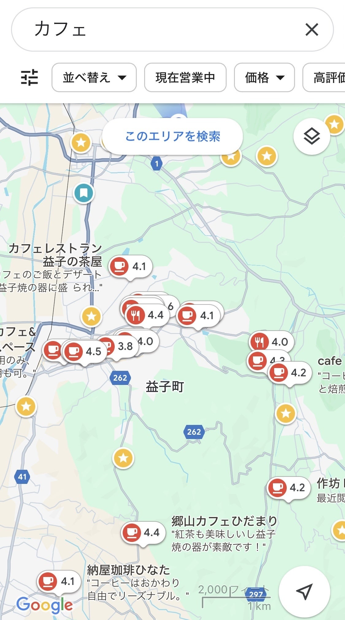 (Googleマップで「カフェ」と検索すると、これだけのお店がヒットします!)
