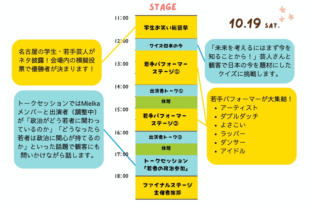 具体的には、大学生のパフォーマーを中心とするステージとキッチンカー出店でフェスのわくわく感を演出しながら、身近なところから政治を「じぶんごと」として捉えられるブースを設置します。