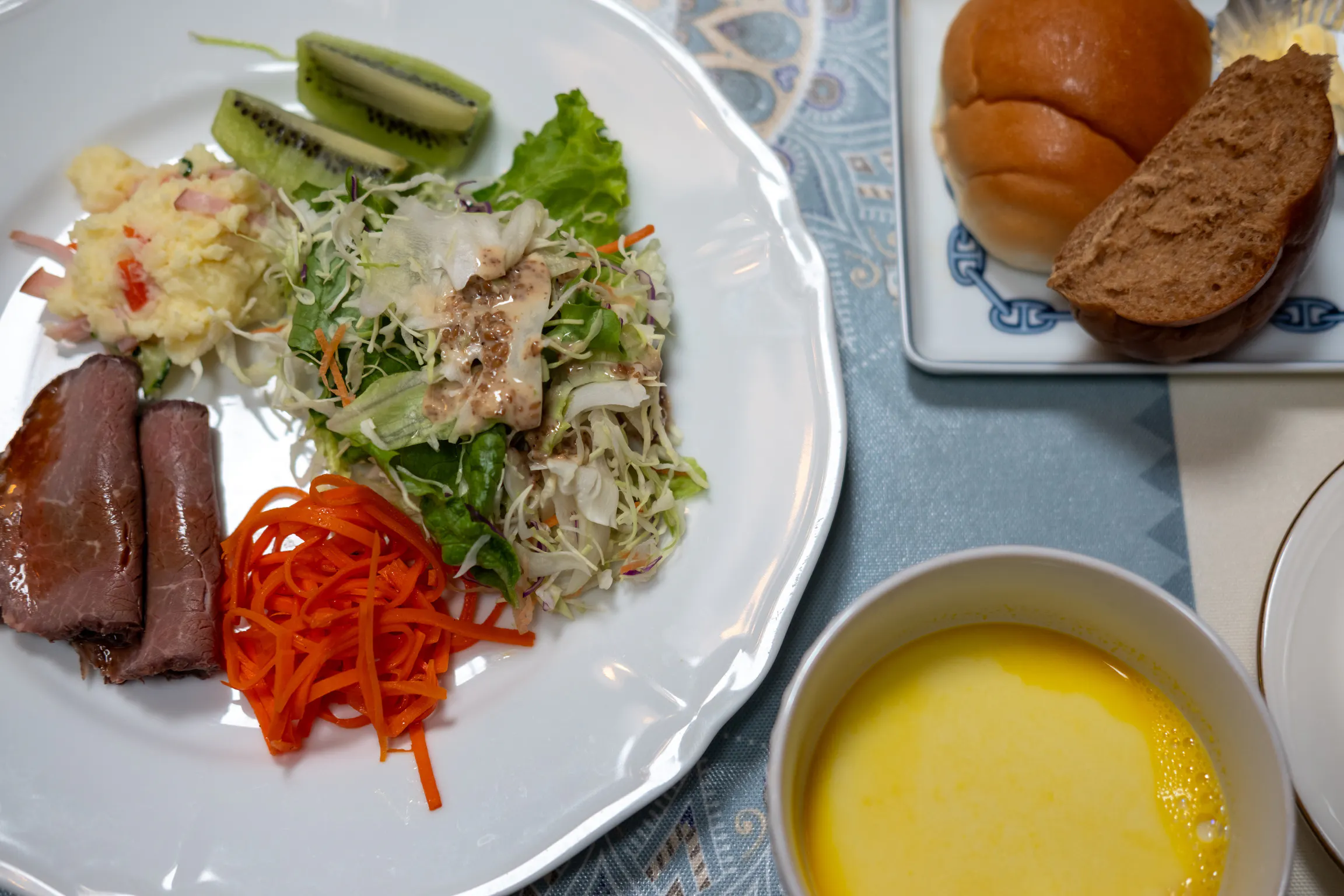 朝は、新鮮な乳製品やサラダ、パンなど、那須の恵みを詰め込んだ朝食をご用意しています。