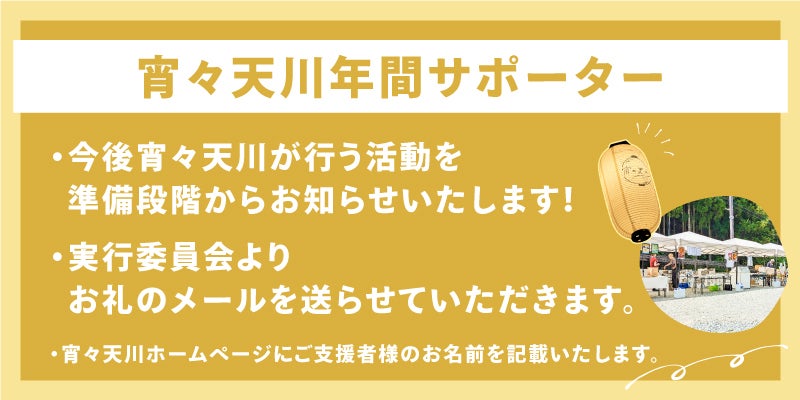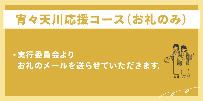 こちらのコースをご選択の方には実行委員会よりお礼のメールを送らせていただき、宵々天川HPへご支援者様のお名前を記載いたします。(掲載期間1年、ご希望でない方も備考欄でお伝えください。)