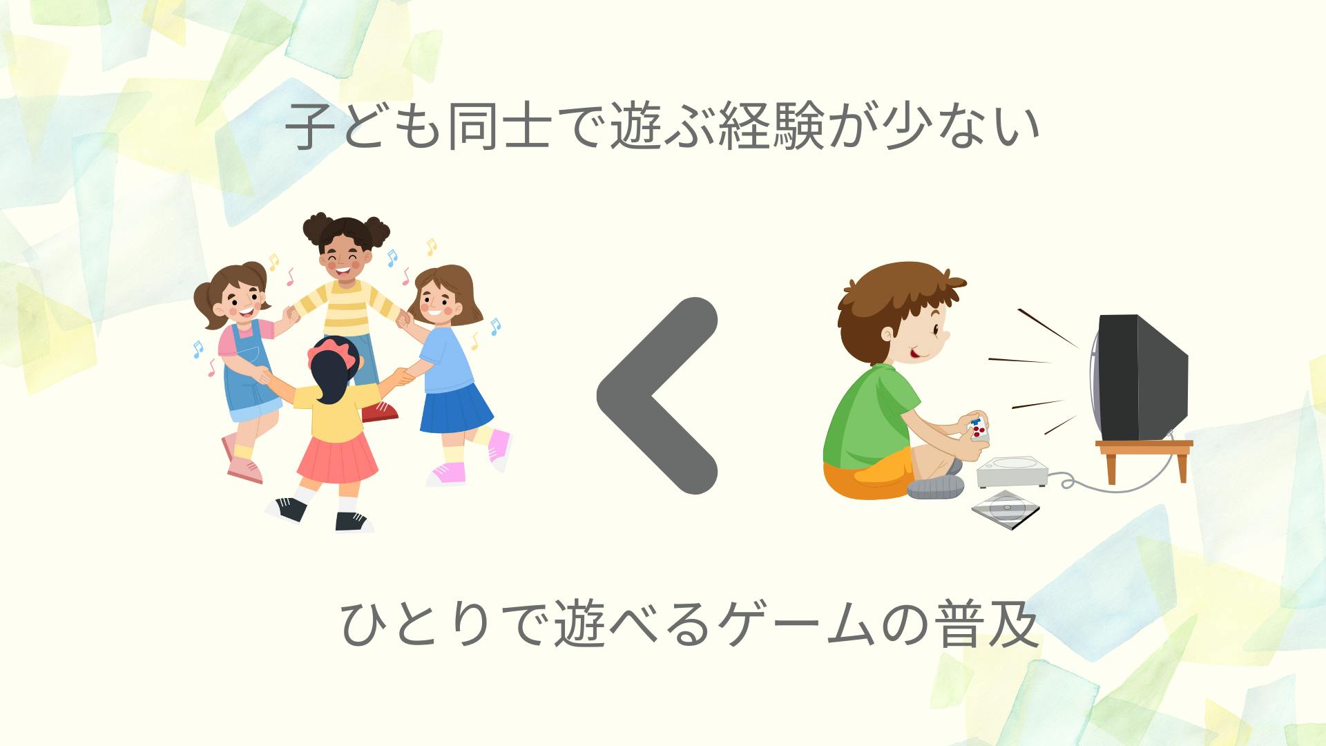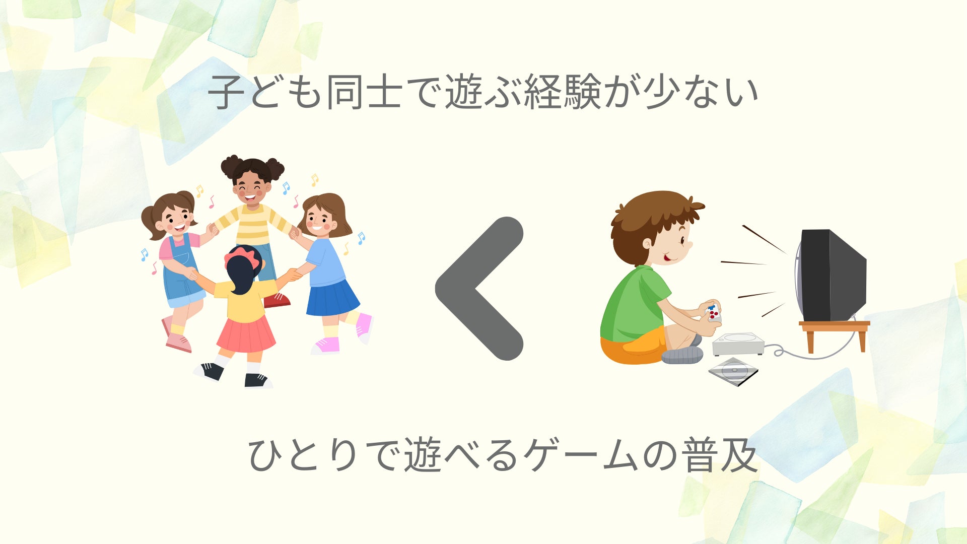 しかし、今は子どもだけで遊ぶ時間は減り、遊びはゲームや動画になり、
