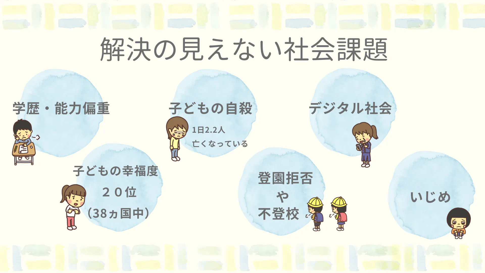 たとえば不登校、いじめ、子どもの幸福度の低さ、子どもの自殺など…