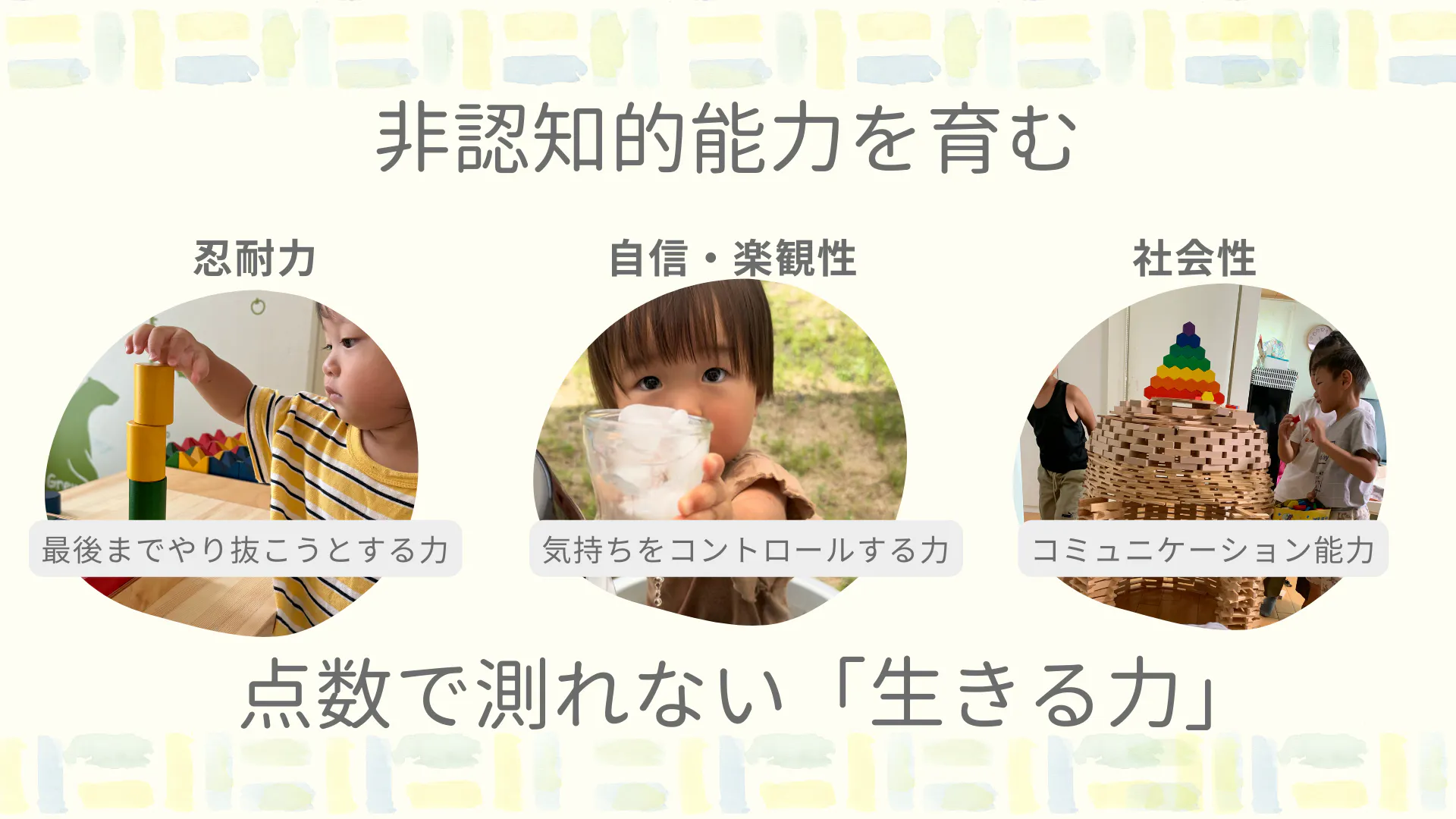 や、その先に育つ認知的力(読み書きや計算など点数で示せる能力)が育めます。