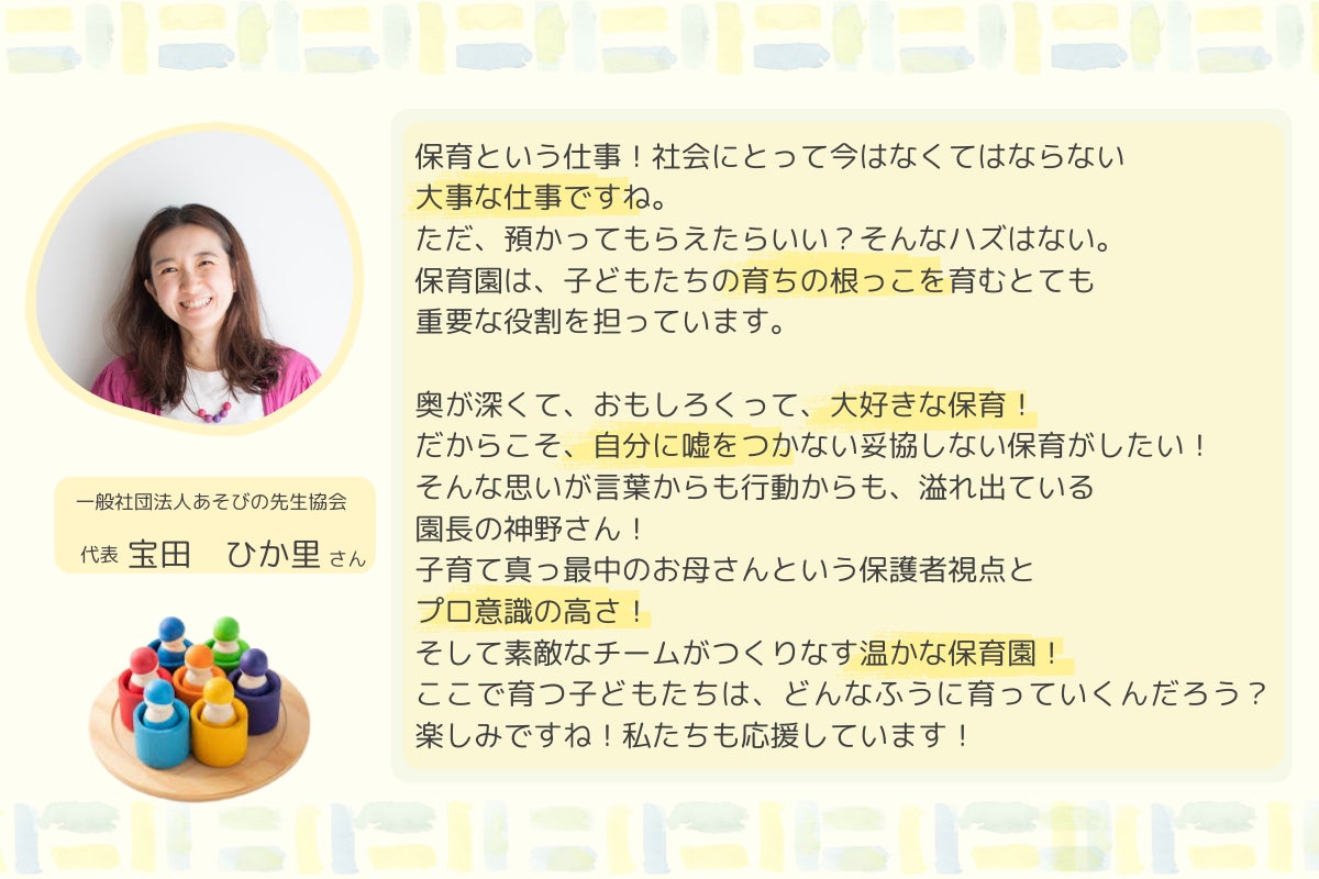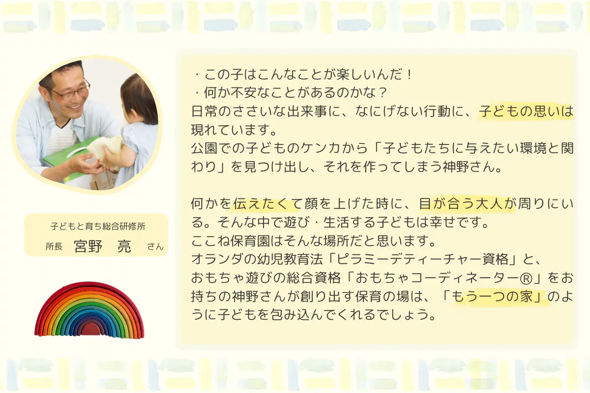 世界一こどもと親がしあわせな保育園だと思います。こどもとは?親とは?ここねメソッドが多くの方に伝わりますように、応援しています!