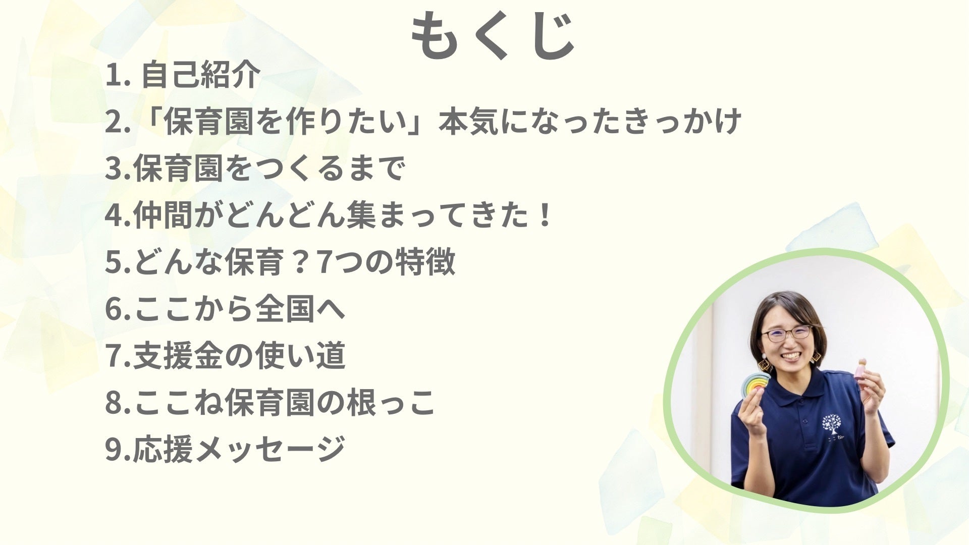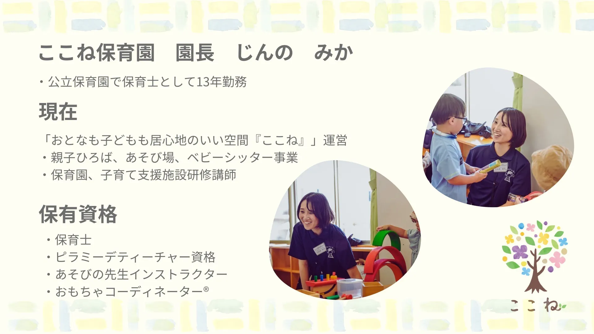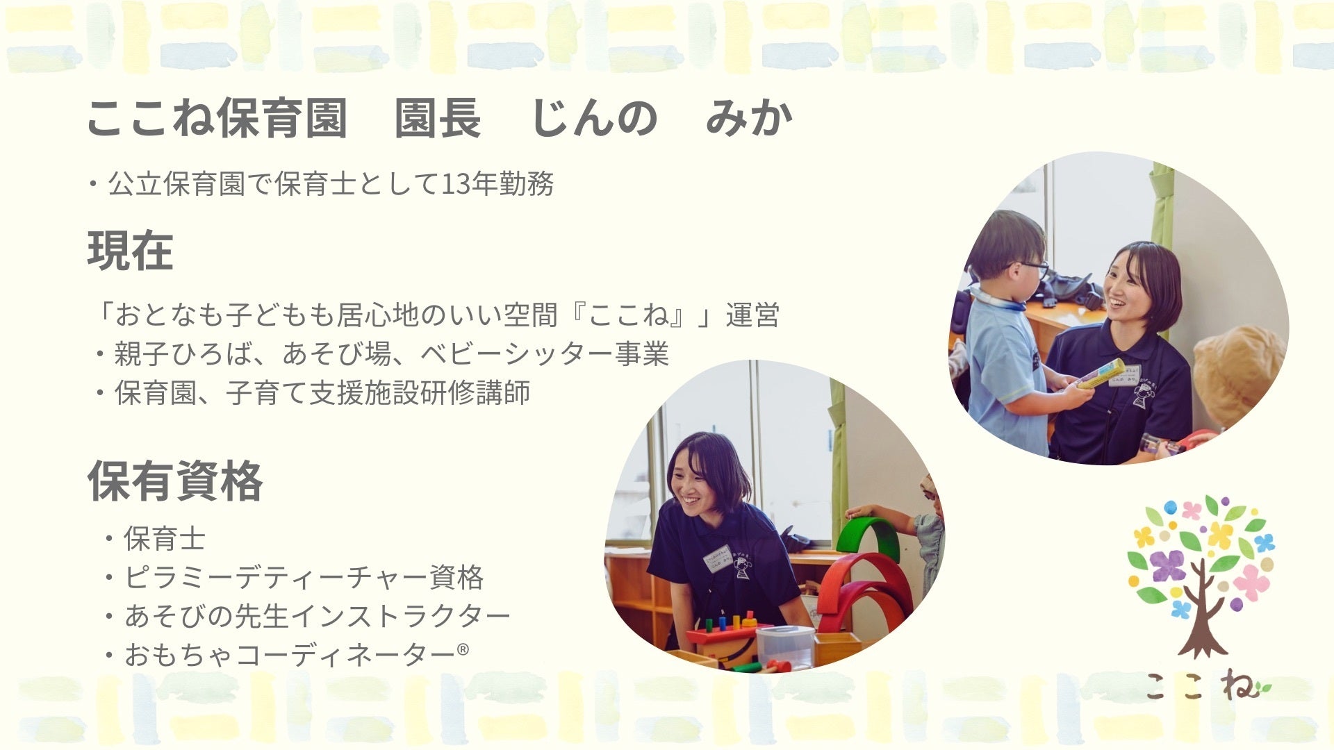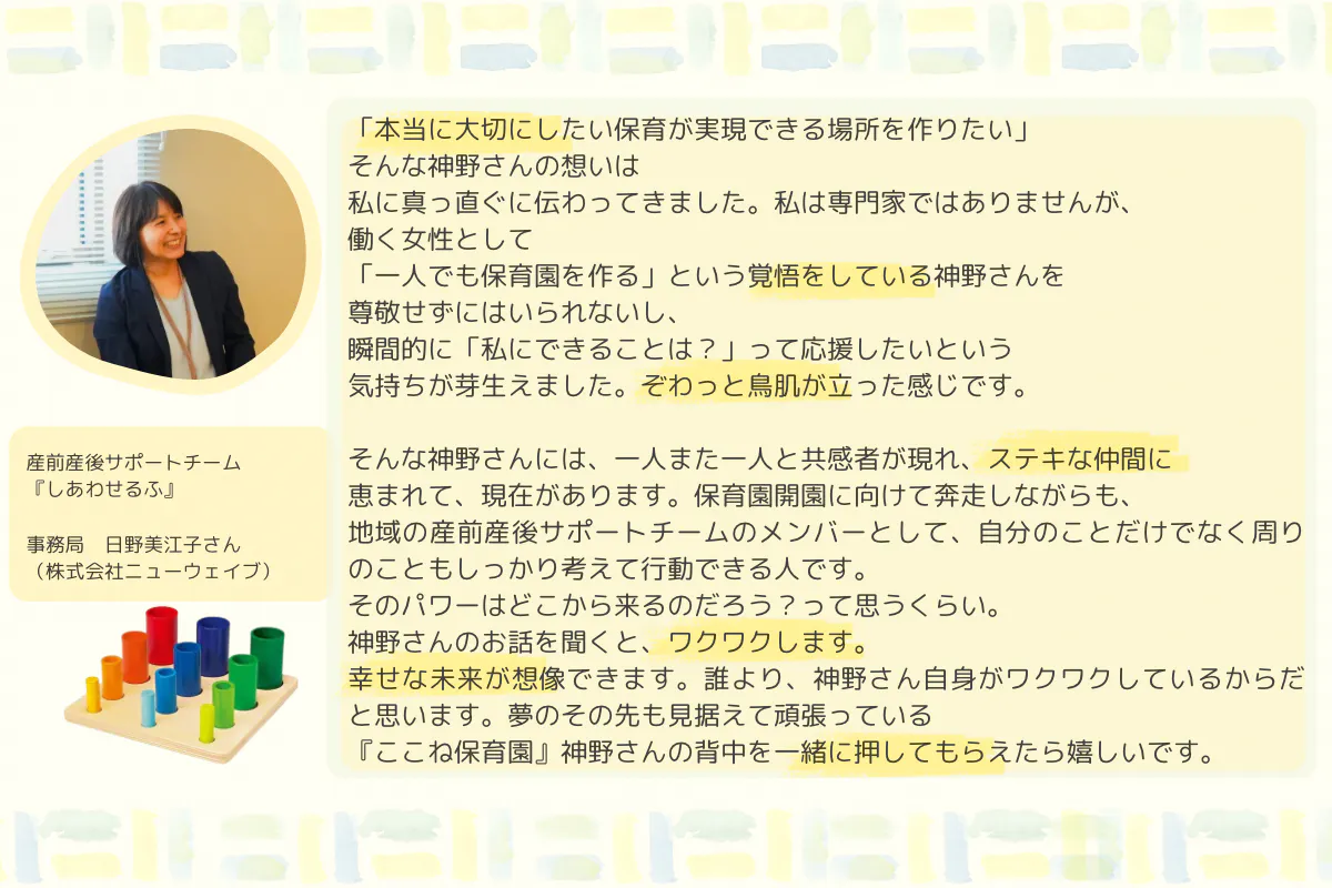 2025/01/06 17:59ついに2週間を切りました!!残りたったの11日‼みなさんの力を借りてここまでこれました!あと少し!あと少しお力を貸してください!ぜひ、あなたの心が動いた一言を添えてシェア拡散よろしくお願いします!今日はイベント出店ここね保育園「キッズスペース」にいつも遊びに来てくれるまいちゃんからの応援メッセージです!____________イベントでは、子どもたちが遊ぶ『場』がとても心地よく、遊びながら学びに繋がるような工夫がたくさん感じられました。会うたびにキラキラ輝いて、勢いがどんどん増しているみか園長。そんなみか園長のまわりには、たくさんの素敵な人たちが集まってきていて、本当に魅力的だなぁと思います。子どもたちの心にぬくもりを届けたいという熱い想いを胸に、全力で頑張っている姿にはいつも感動させられます。未来を担う子どもたちを優しく見守りながら、一歩一歩挑戦を続けるここね保育園。その熱い想いがたくさんの子どもたちや保護者に笑顔と安心を届けられるよう、これからもずっと応援しています!________まいちゃん自身も「子育ての繋がりを」とイベントを主催しています!2/16 にはこちらのイベントが開催されます♡もちろん私も参加します!子育ては1人ではできません!だからこそ色々な人と繋がって一緒に子育てしませんか?講演会会場にはここね保育園の「心を育むおもちゃ」をお持ちします。講演会というと・大人のやりたいに付き合ってもらっている罪悪感・待てない子どもにイライラ怒っちゃう・会場から出て行ってしまいそうで不安お子さんがいると大人の「やってみたい」をあきらめることはありませんか、、、?せっかくの「やってみたい」をあきらめるのはもったいない!大人も子どももも〈自分らしく〉人生を歩むそれがここね保育園の目指す社会です。そのお手伝いをここね保育園の強みである環境つくりでさせていただきます!!遊びこめる机の配置や仕掛け心とあたまと体を使うおもちゃで「大人も子どもも居心地のいい空間」をあなたのいつもの場所に作ってみませんか??今回のクラウドファンディング返礼品「あなたの場所がキッズスペースに」をご用意させていただいています!!ぜひ、ご覧になっていただけると嬉しいです!!一緒に「大人も子どもも自分らしく生きる社会を作っていきましょう!!」クラファン内容 もっと見る
